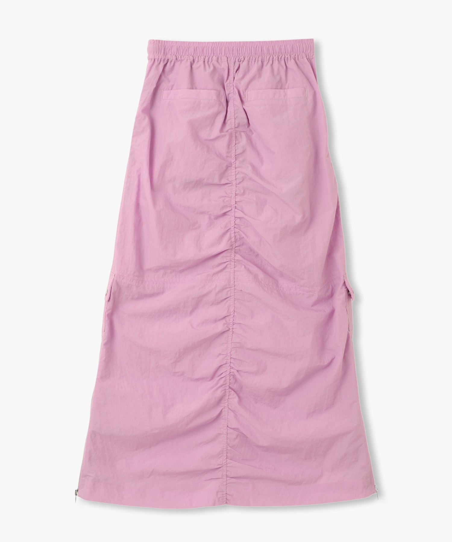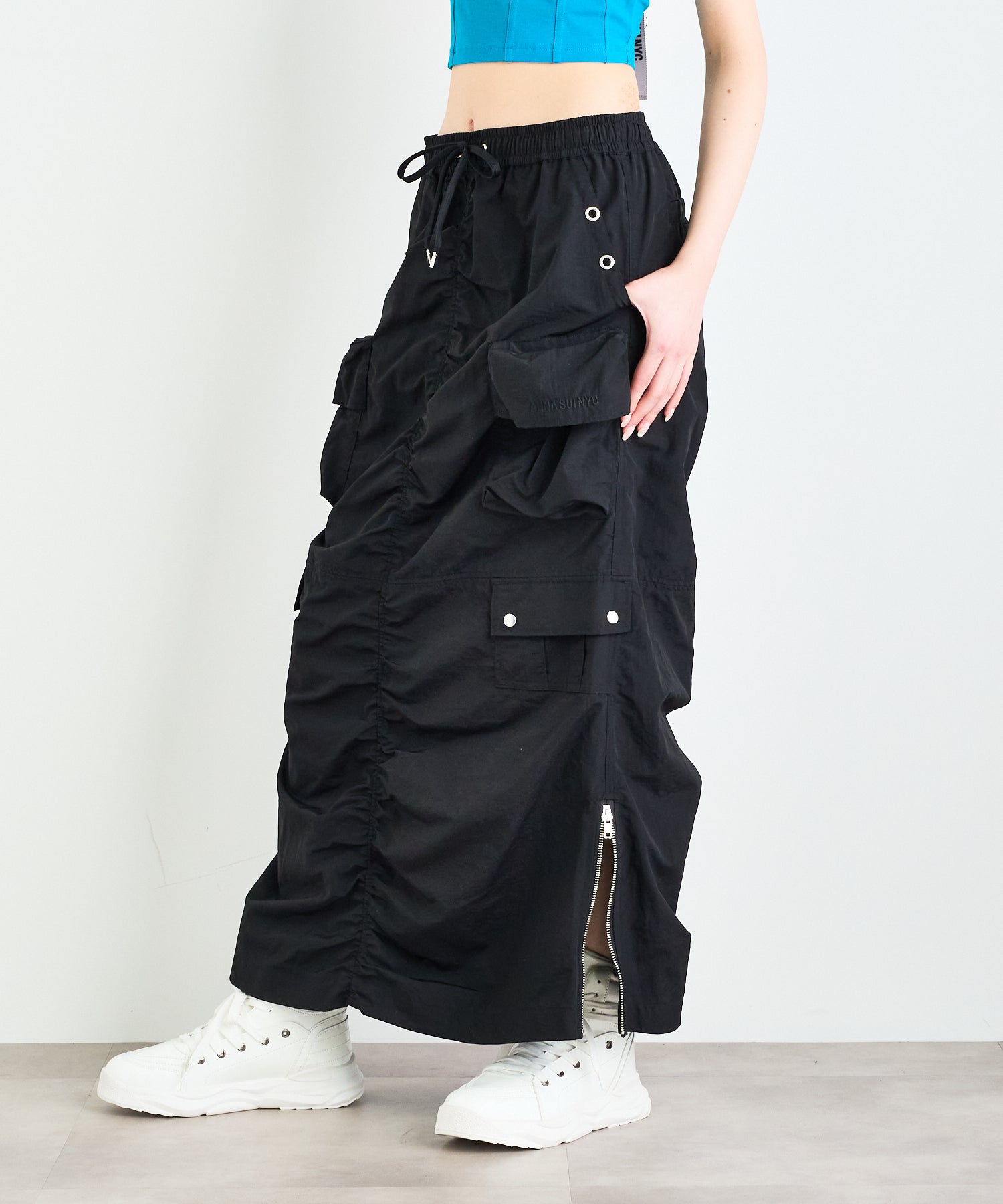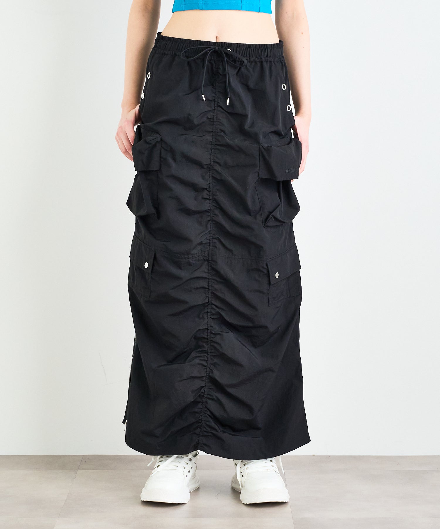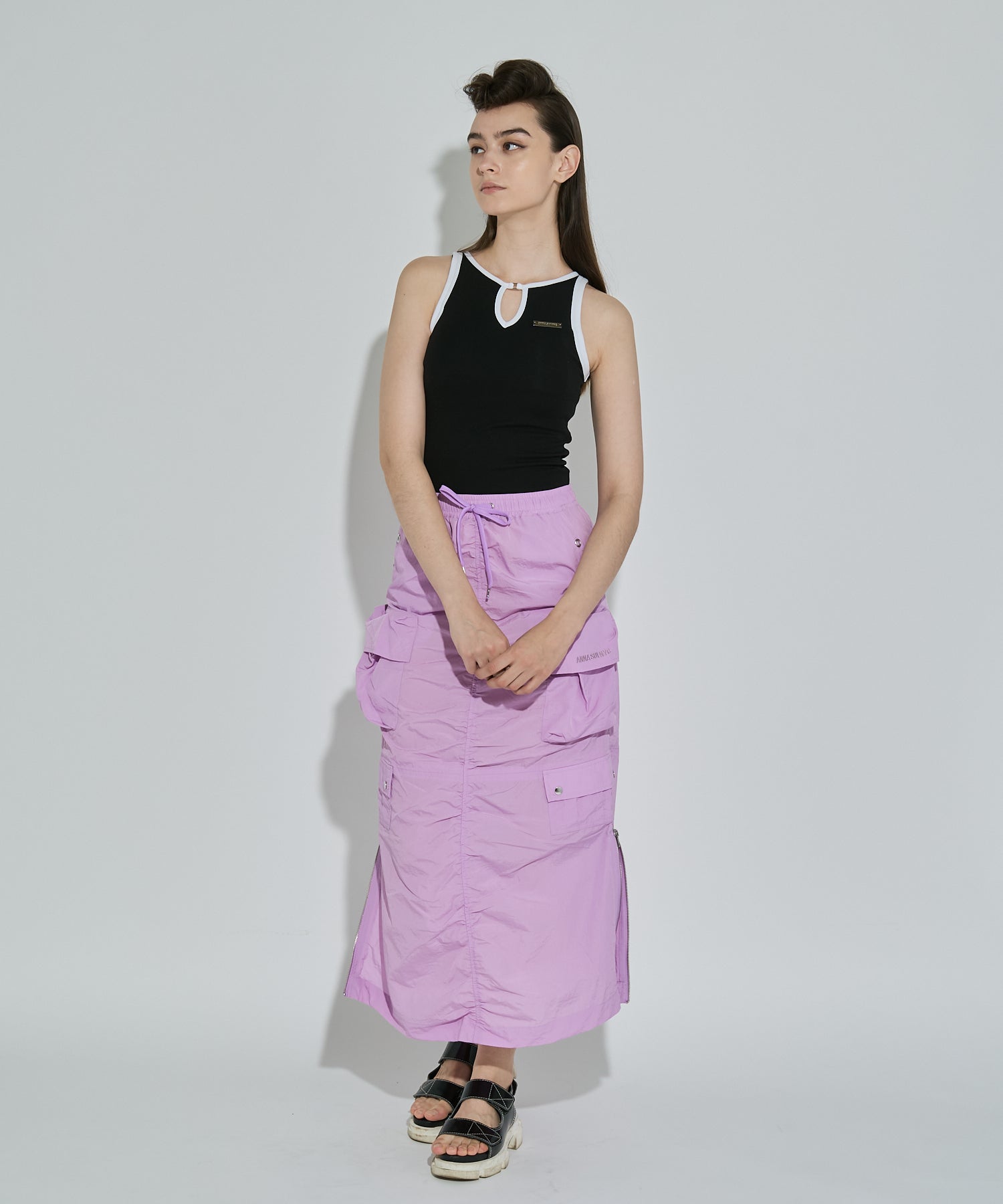 シワ感のある軽くシャカシャカとした素材で作られたマルチポケットスカート。様々なデザインのポケットが配置され洗練されたデザインに。裾のサイドファスナーを開けて着用すると足元が見え涼しげな雰囲気に。ウエストの内側にはボタンが付いており、"スポーツワッシャーレースアップベスト"とドッキングさせてセットアップで着用できるANNA SUI NYC オリジナルのとっておきアイテムです!