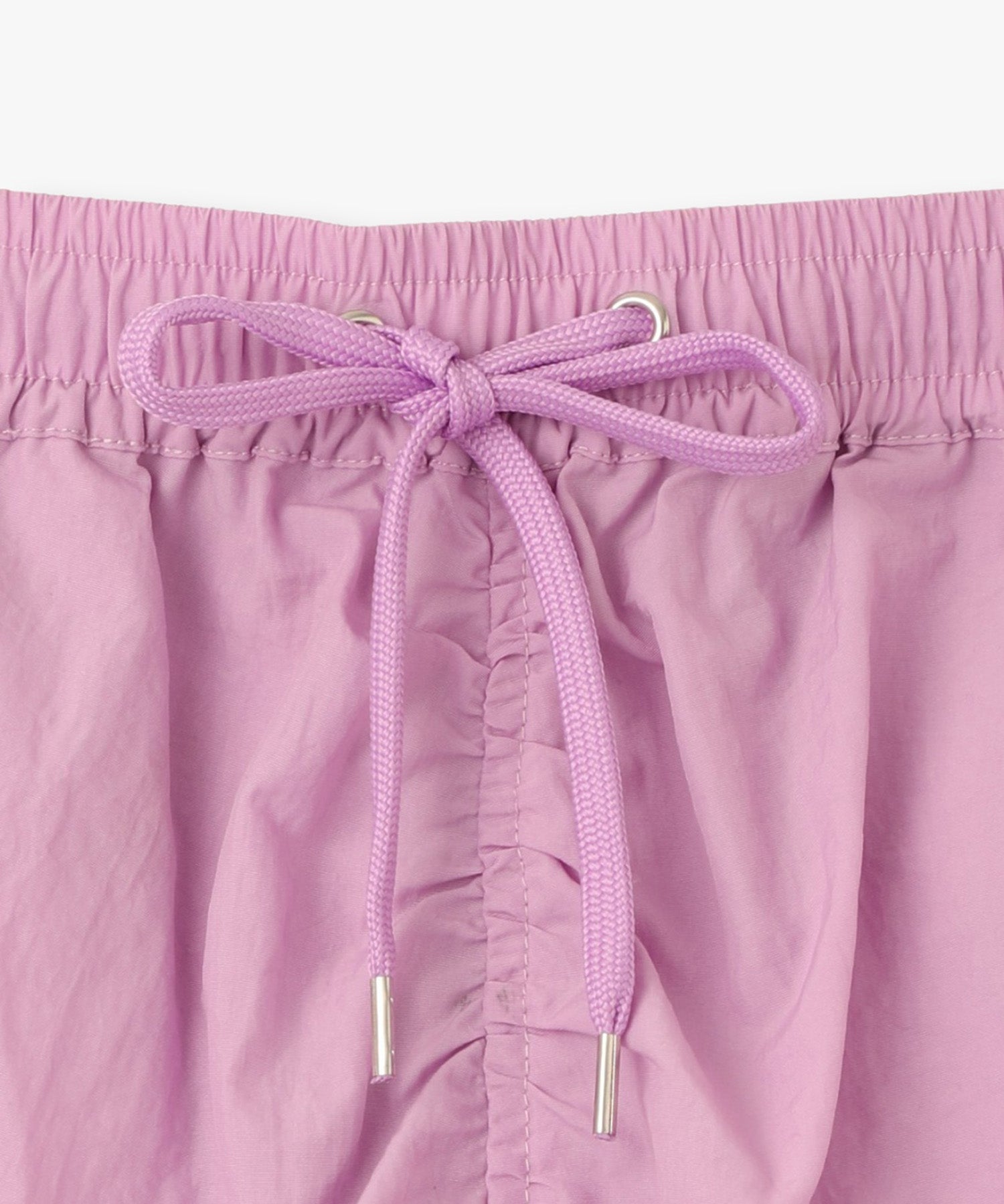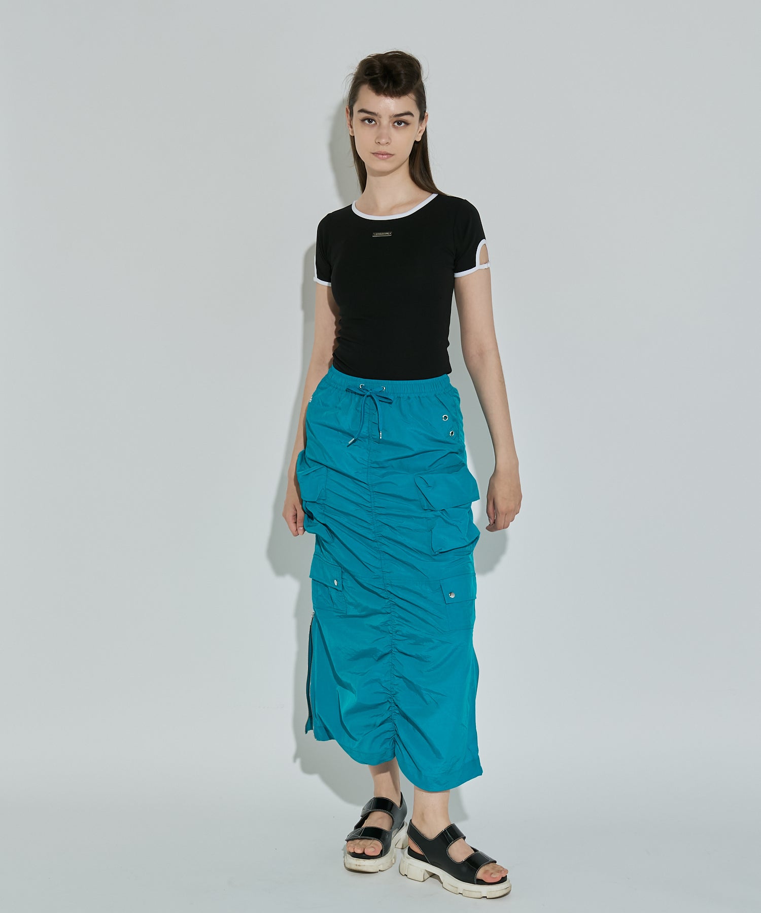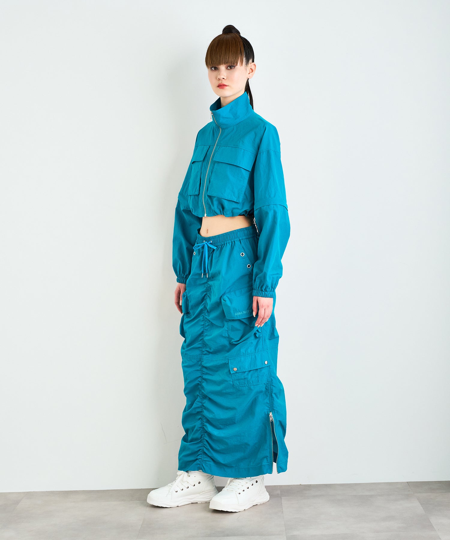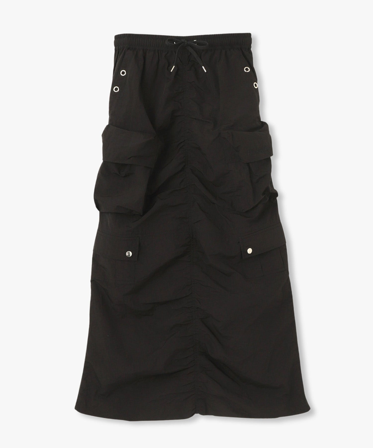 シワ感のある軽くシャカシャカとした素材で作られたマルチポケットスカート。様々なデザインのポケットが配置され洗練されたデザインに。裾のサイドファスナーを開けて着用すると足元が見え涼しげな雰囲気に。ウエストの内側にはボタンが付いており、"スポーツワッシャーレースアップベスト"とドッキングさせてセットアップで着用できるANNA SUI NYC オリジナルのとっておきアイテムです!