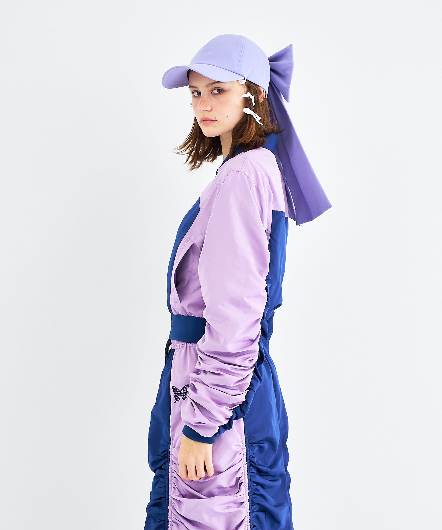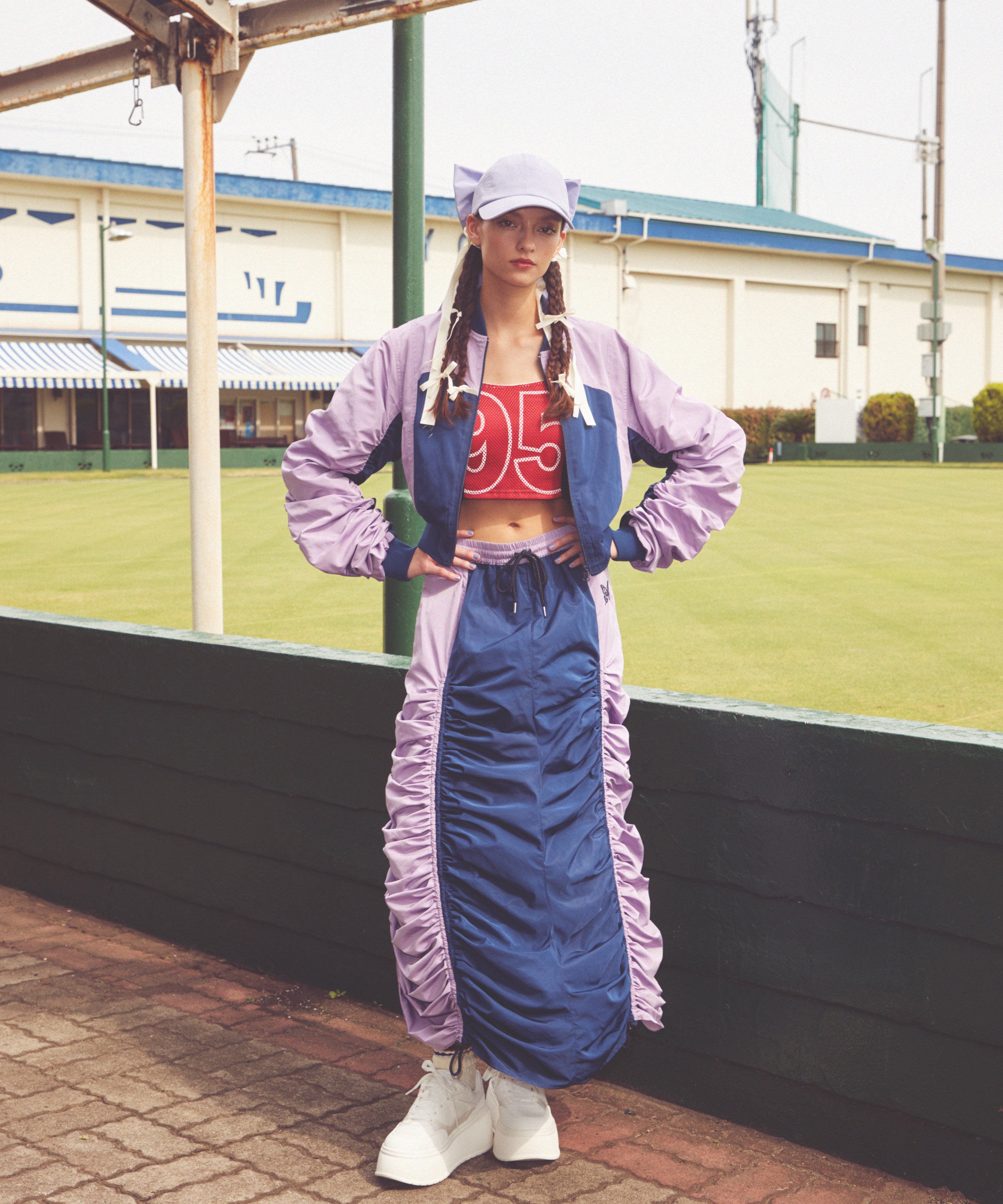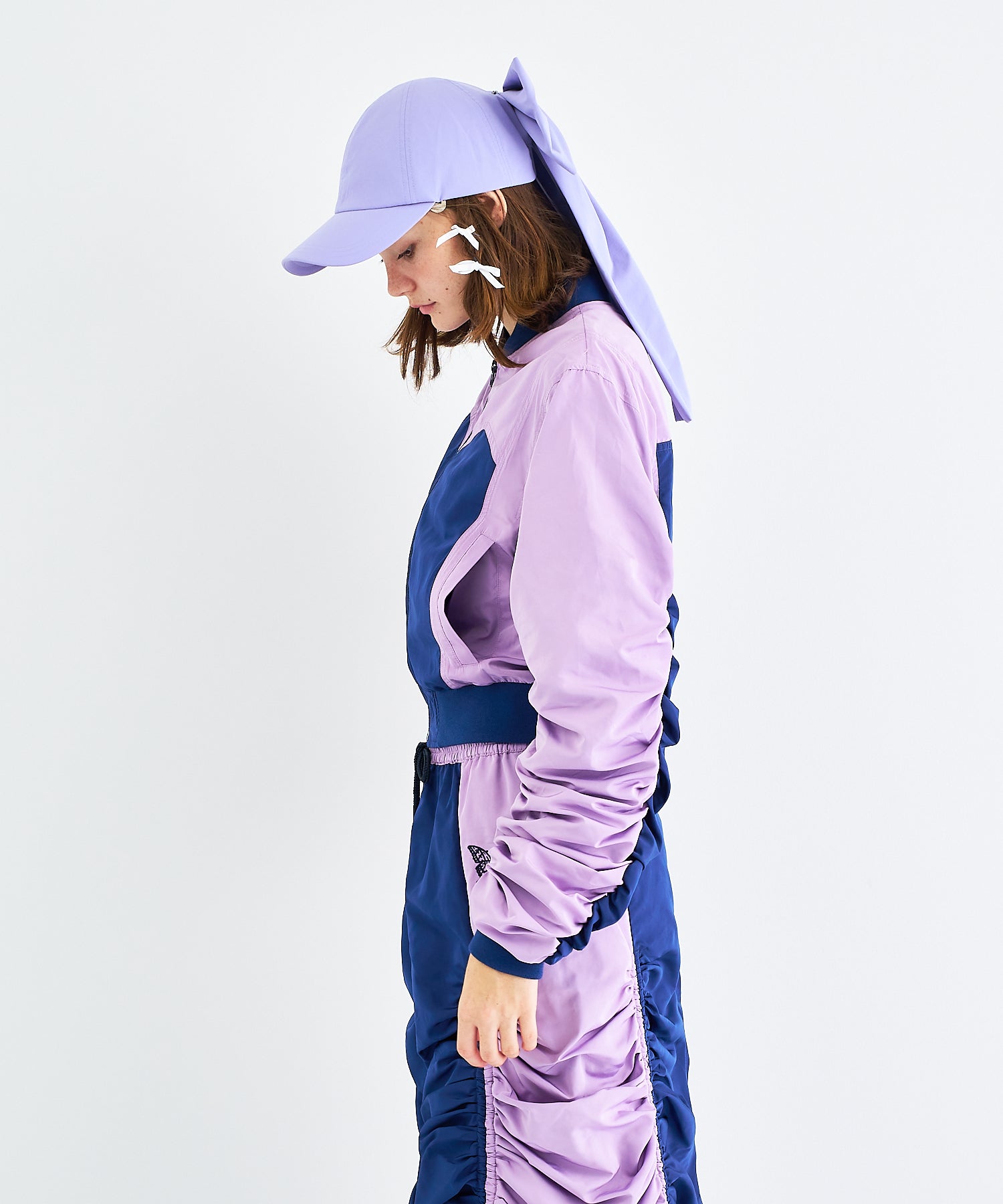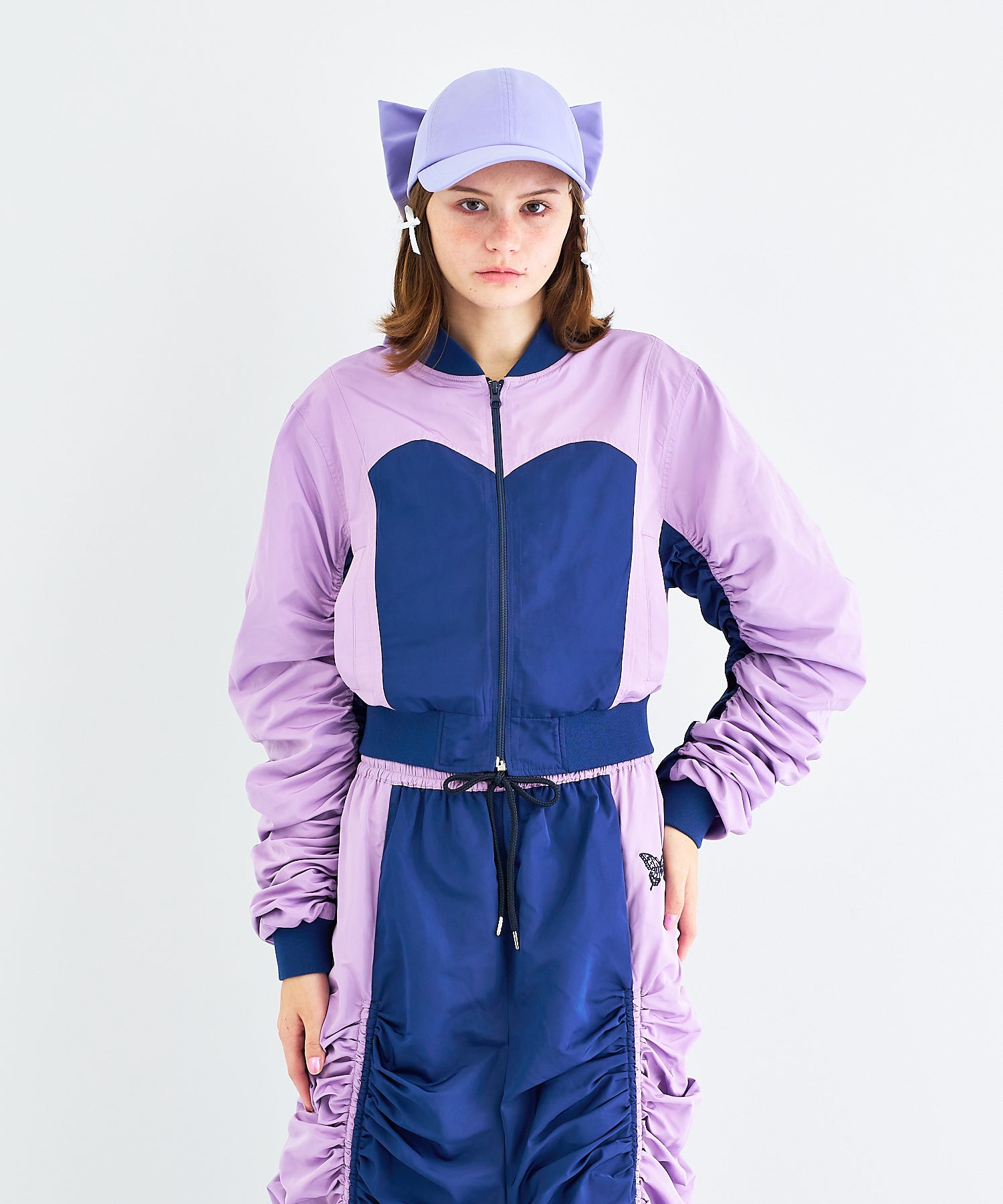 バイカラーが印象的なトラックジャケット。フロントがビスチェのような切り替えになっており唯一無二なデザインに。コンパクトなサイジングですが、袖にはシャーリングを寄せており存在感があります。背中にはANNA SUIの象徴である蝶モチーフの刺繍が入っています。セットアップで"シャーリングドロストロングスカート"を合わせると完成度の高いスタイリングを楽しめます!