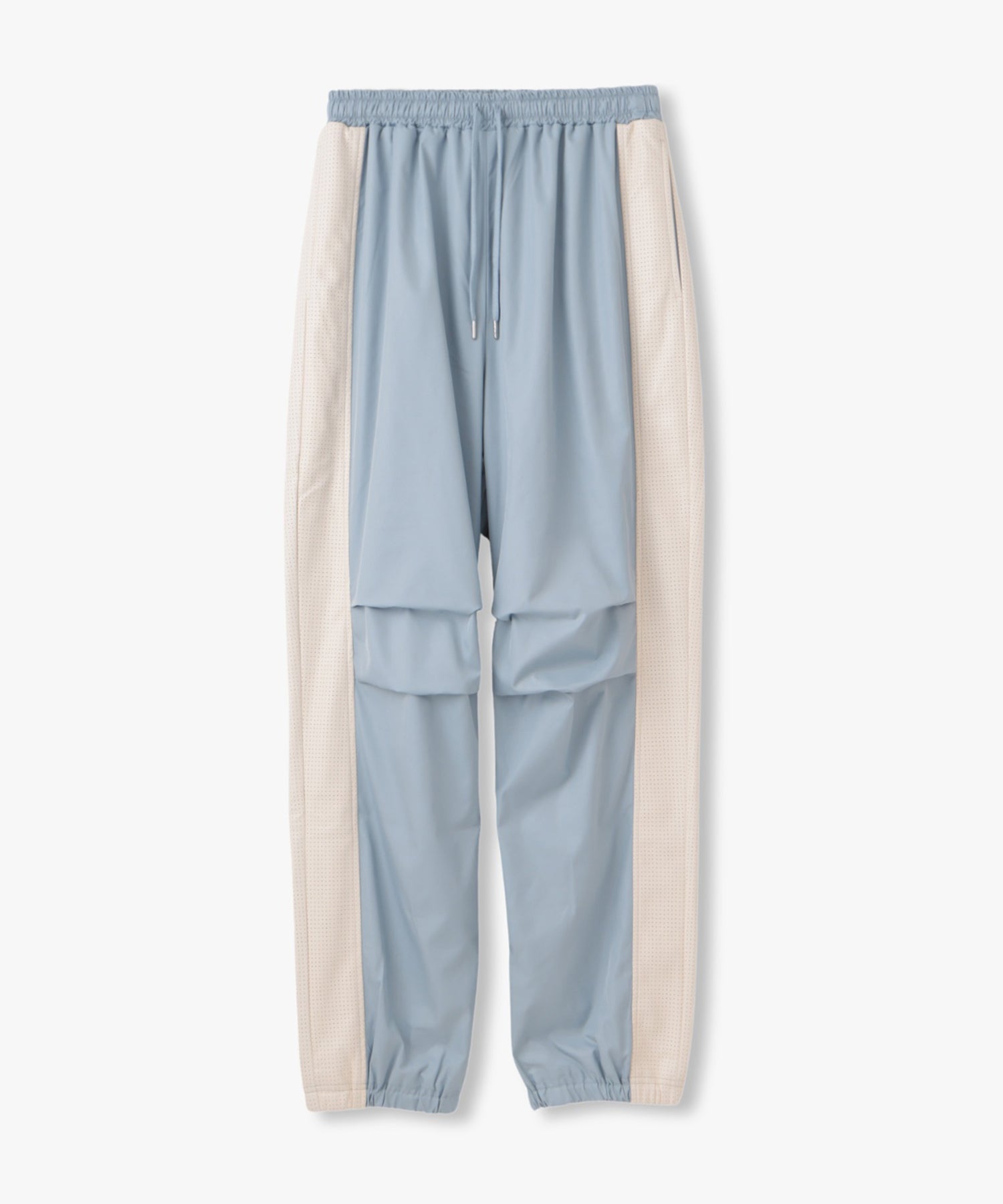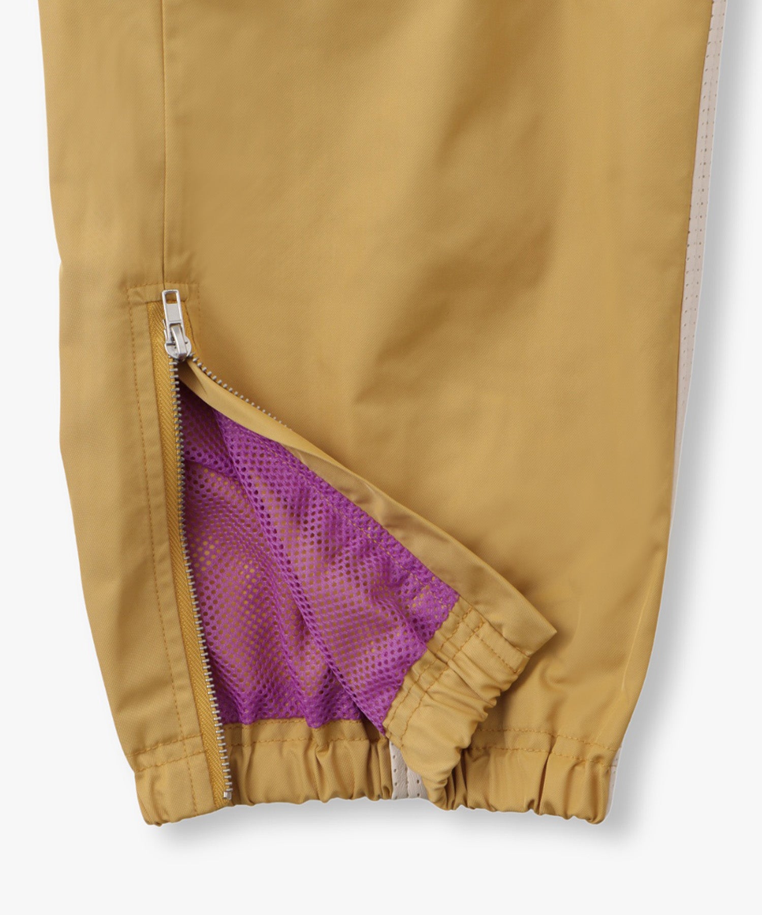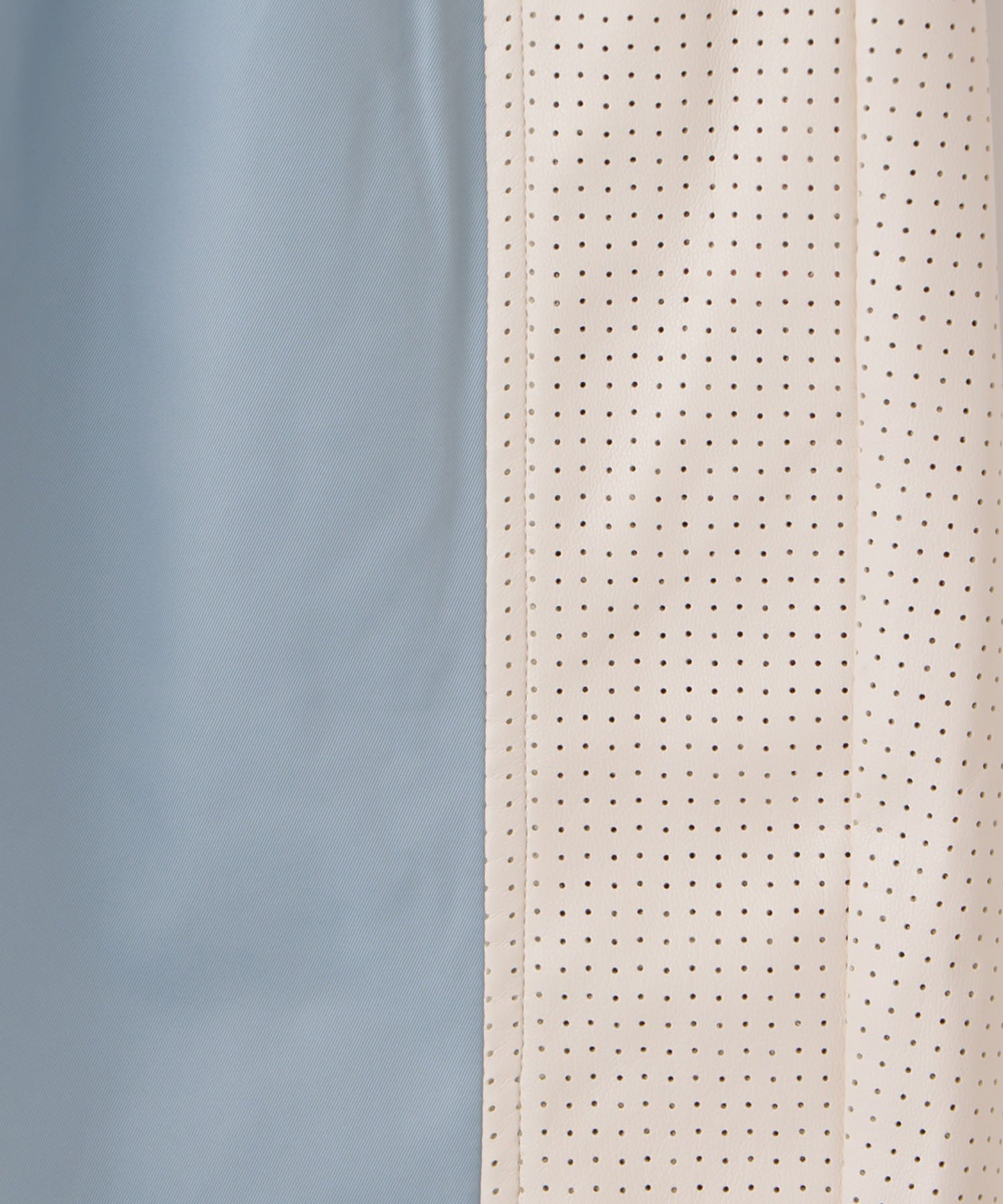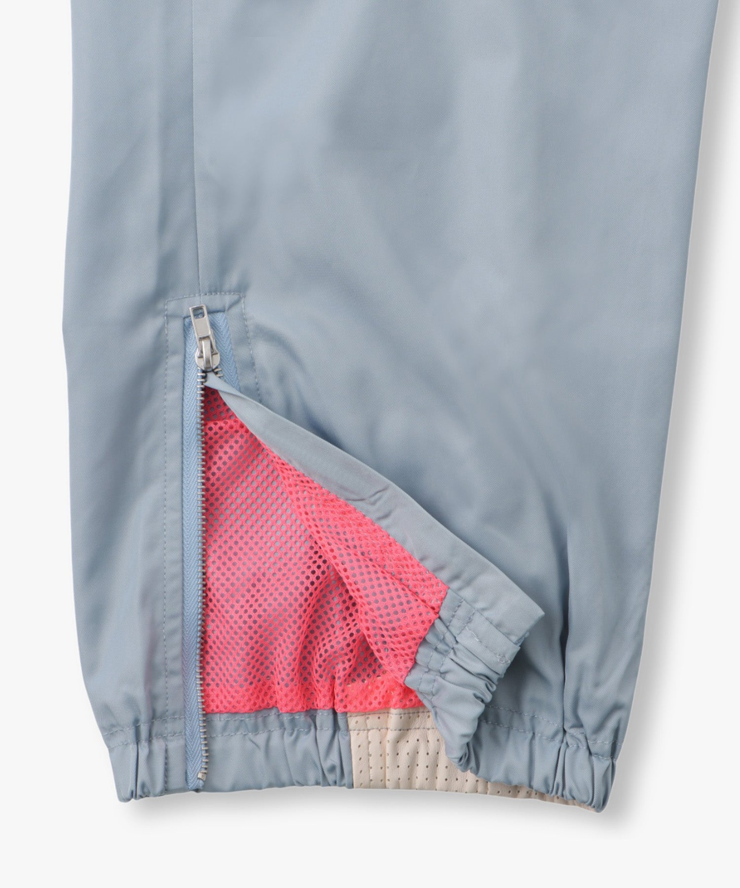 全体には上品な光沢があるツイル素材を使用し、サイドにはドットの穴が空いたパンチングレザー生地を使いました。中にはメッシュ裏地を付けているため、まだ少し暑さの残る秋口にもムレ感なく着用いただける履き心地のいいパンツです。裾のファスナーを開けて着用すると裏地の配色メッシュがのぞき込み、一味違ったスタイリングを楽しむことができます。