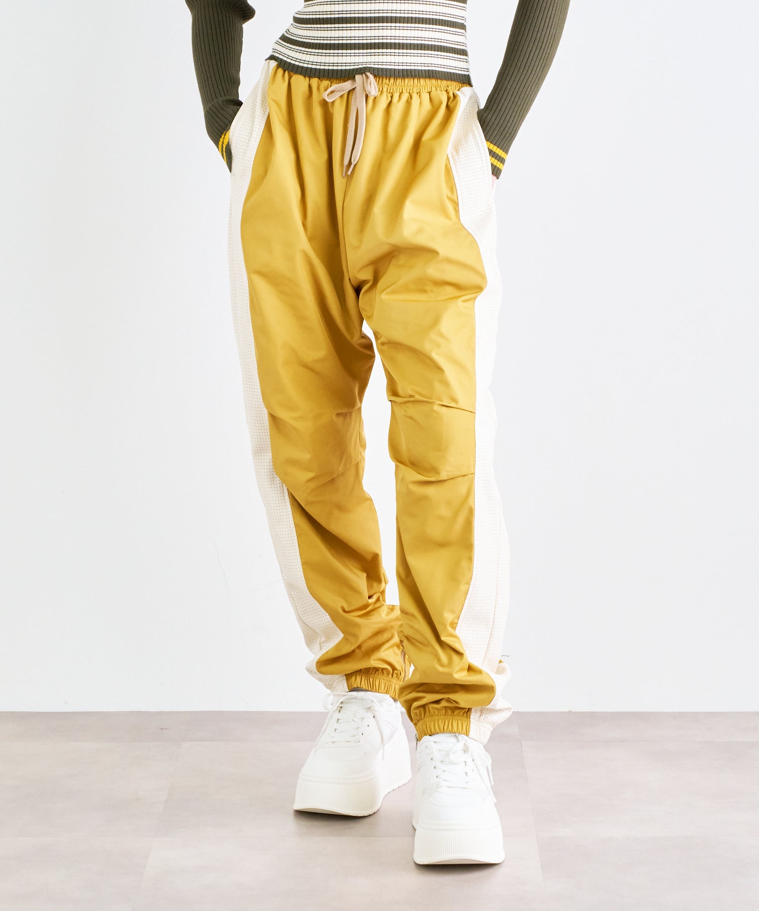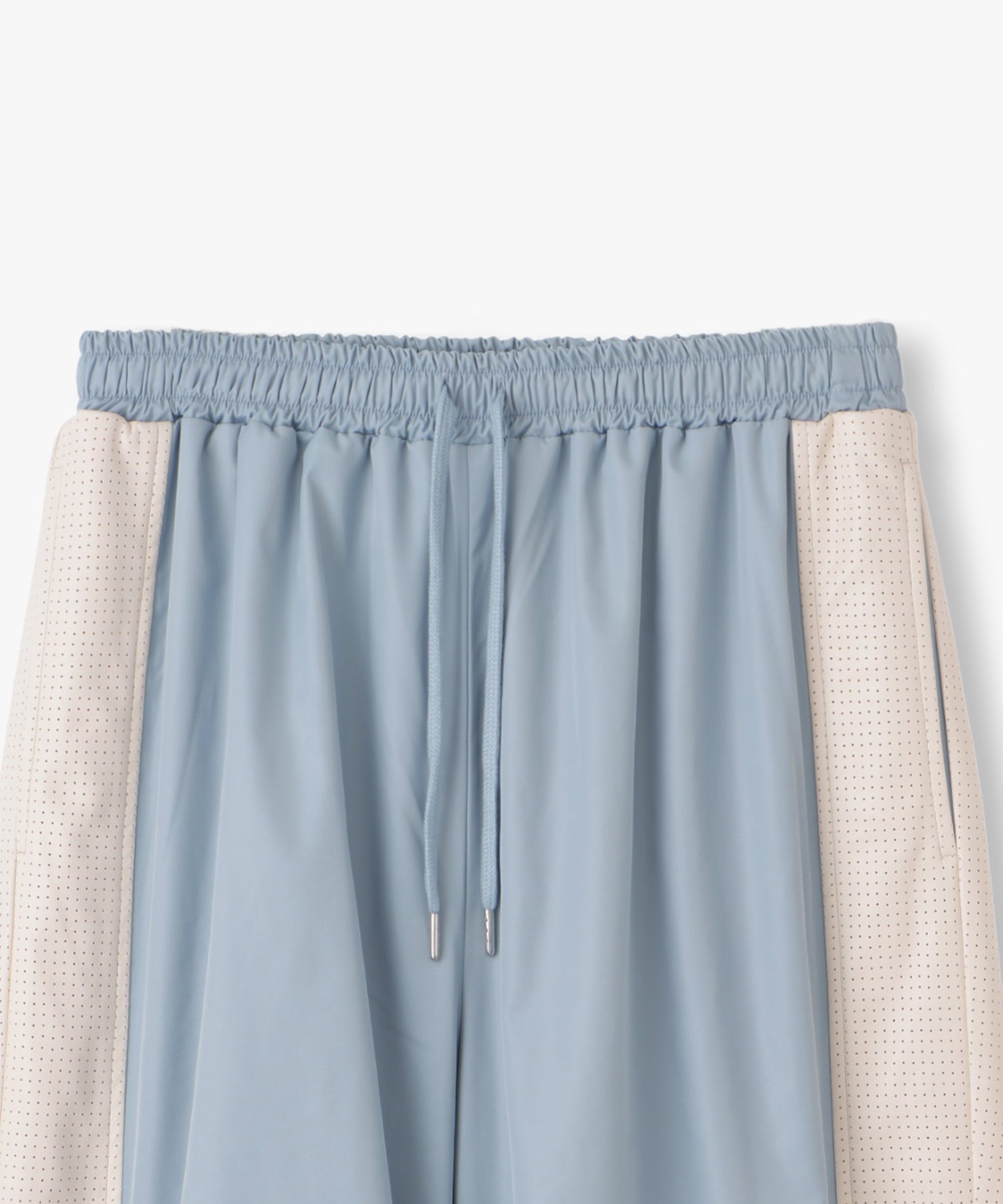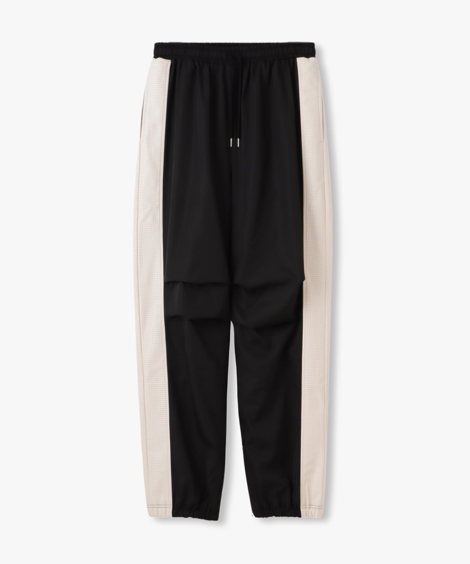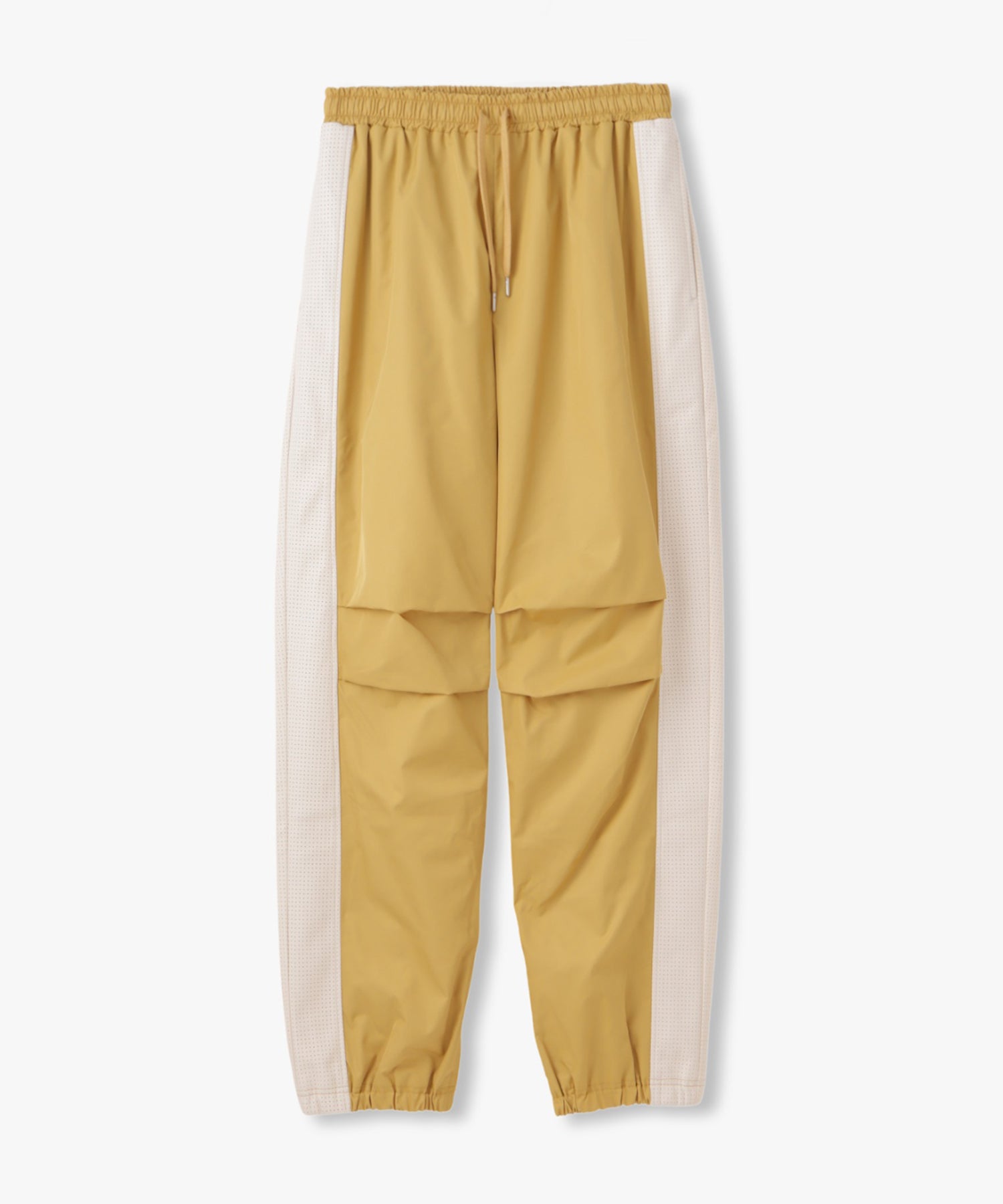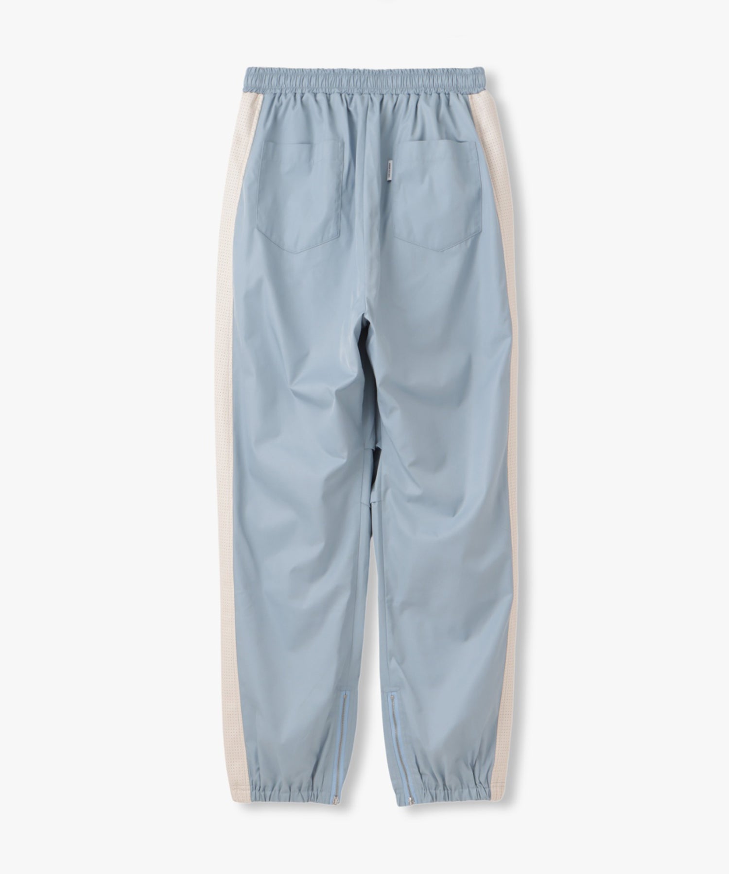 全体には上品な光沢があるツイル素材を使用し、サイドにはドットの穴が空いたパンチングレザー生地を使いました。中にはメッシュ裏地を付けているため、まだ少し暑さの残る秋口にもムレ感なく着用いただける履き心地のいいパンツです。裾のファスナーを開けて着用すると裏地の配色メッシュがのぞき込み、一味違ったスタイリングを楽しむことができます。