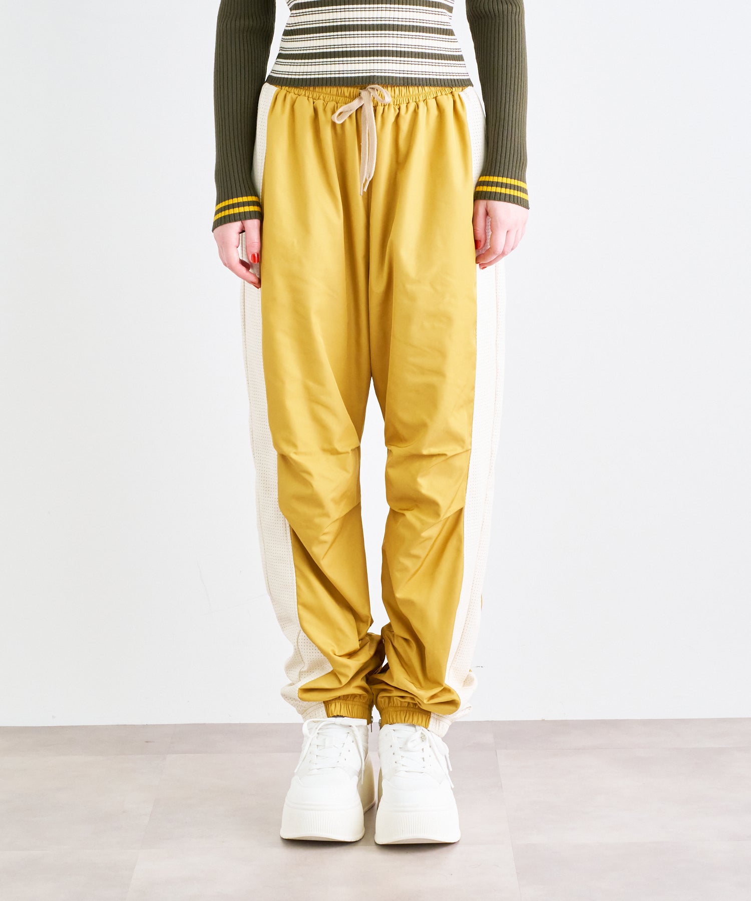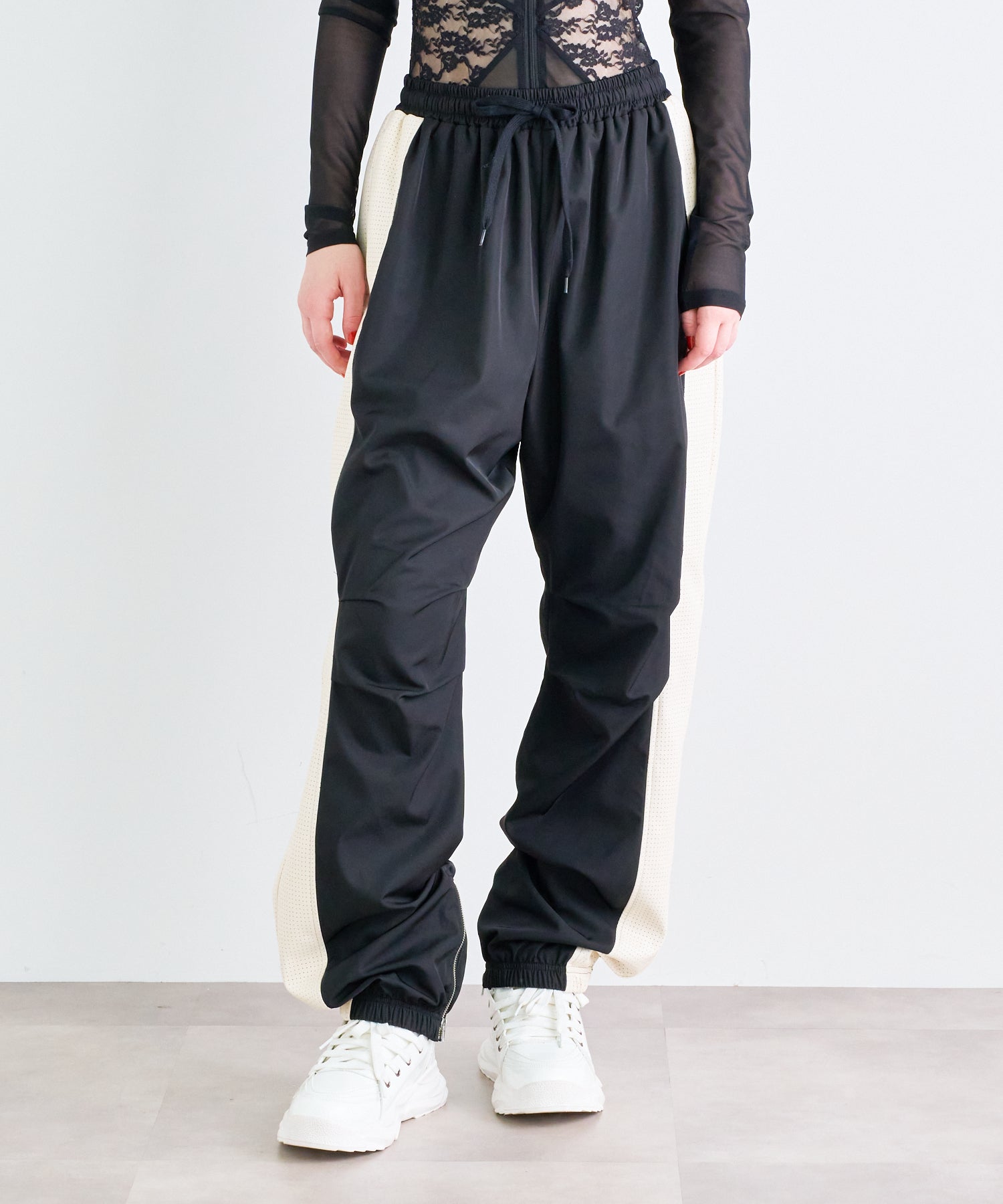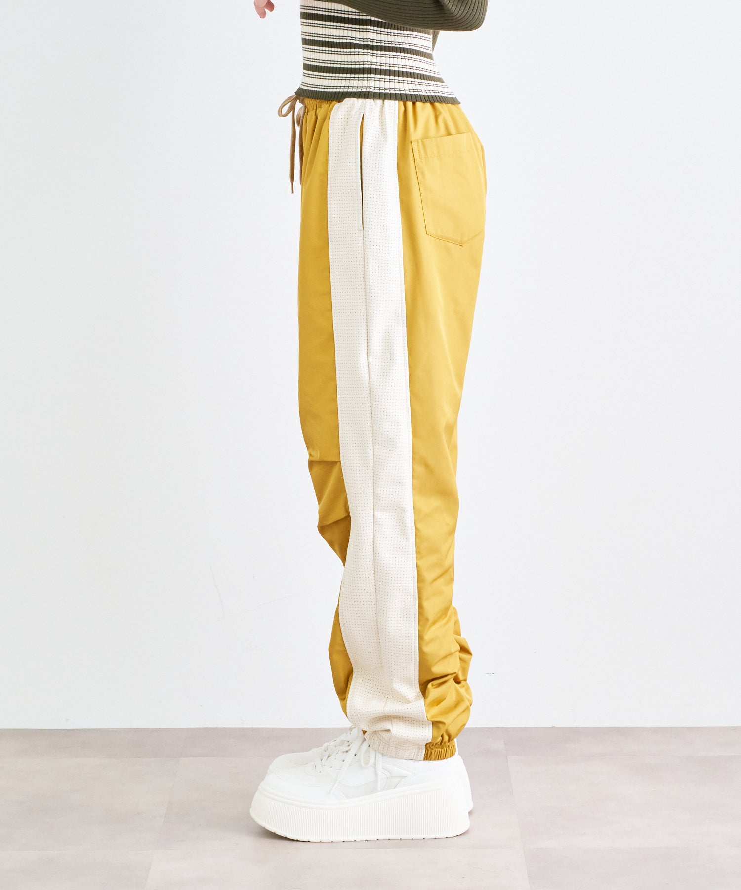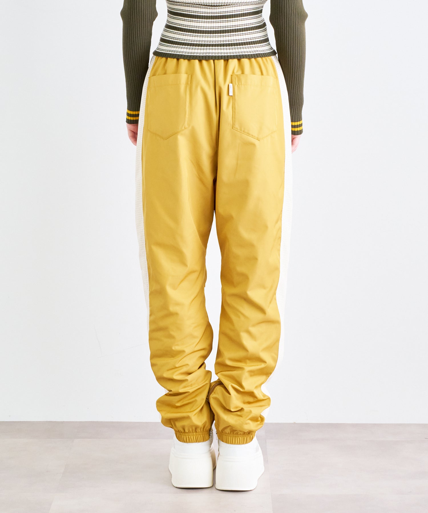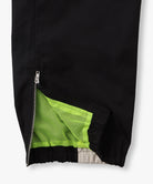 全体には上品な光沢があるツイル素材を使用し、サイドにはドットの穴が空いたパンチングレザー生地を使いました。中にはメッシュ裏地を付けているため、まだ少し暑さの残る秋口にもムレ感なく着用いただける履き心地のいいパンツです。裾のファスナーを開けて着用すると裏地の配色メッシュがのぞき込み、一味違ったスタイリングを楽しむことができます。