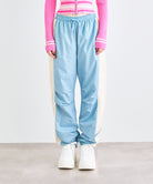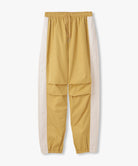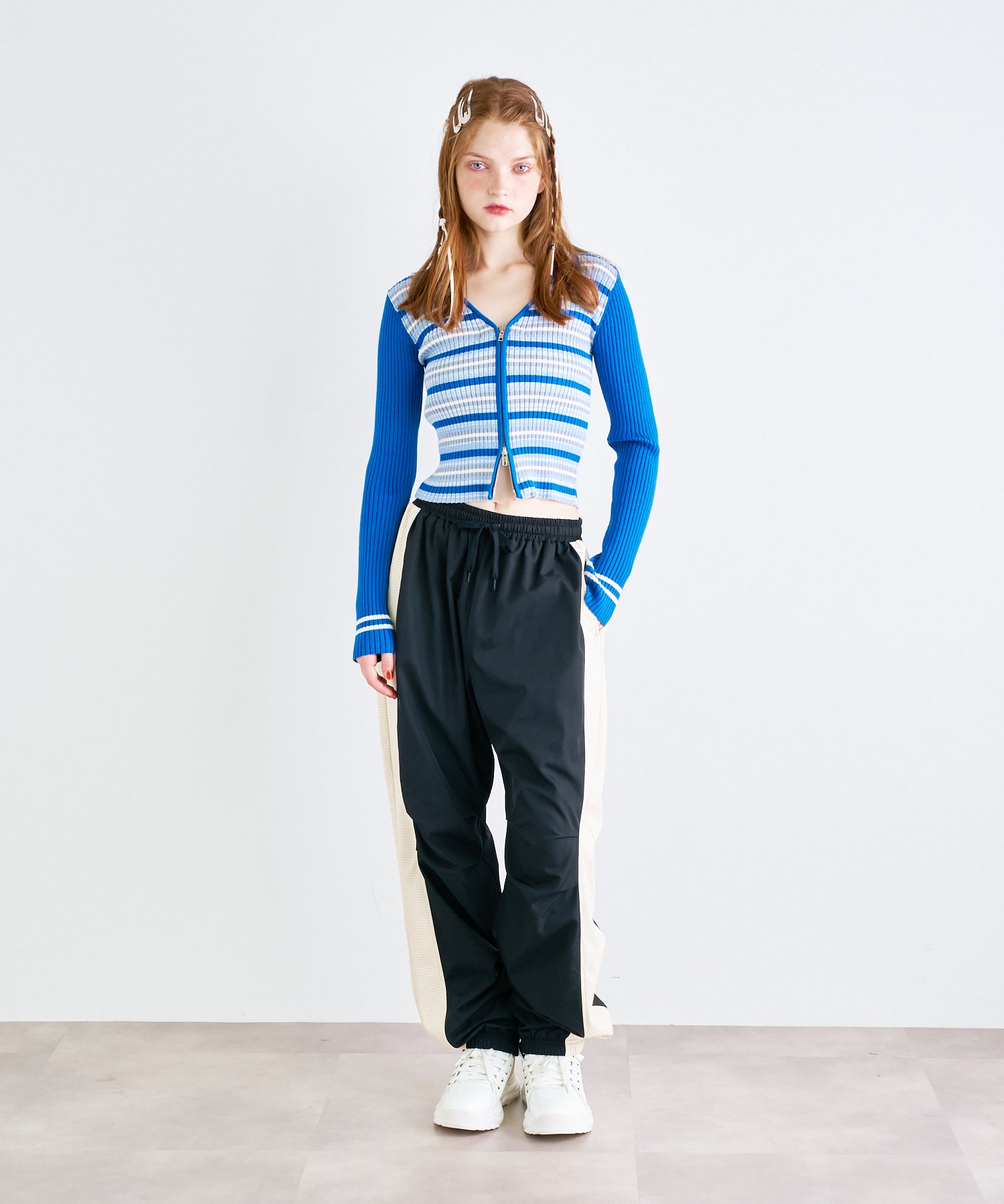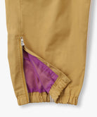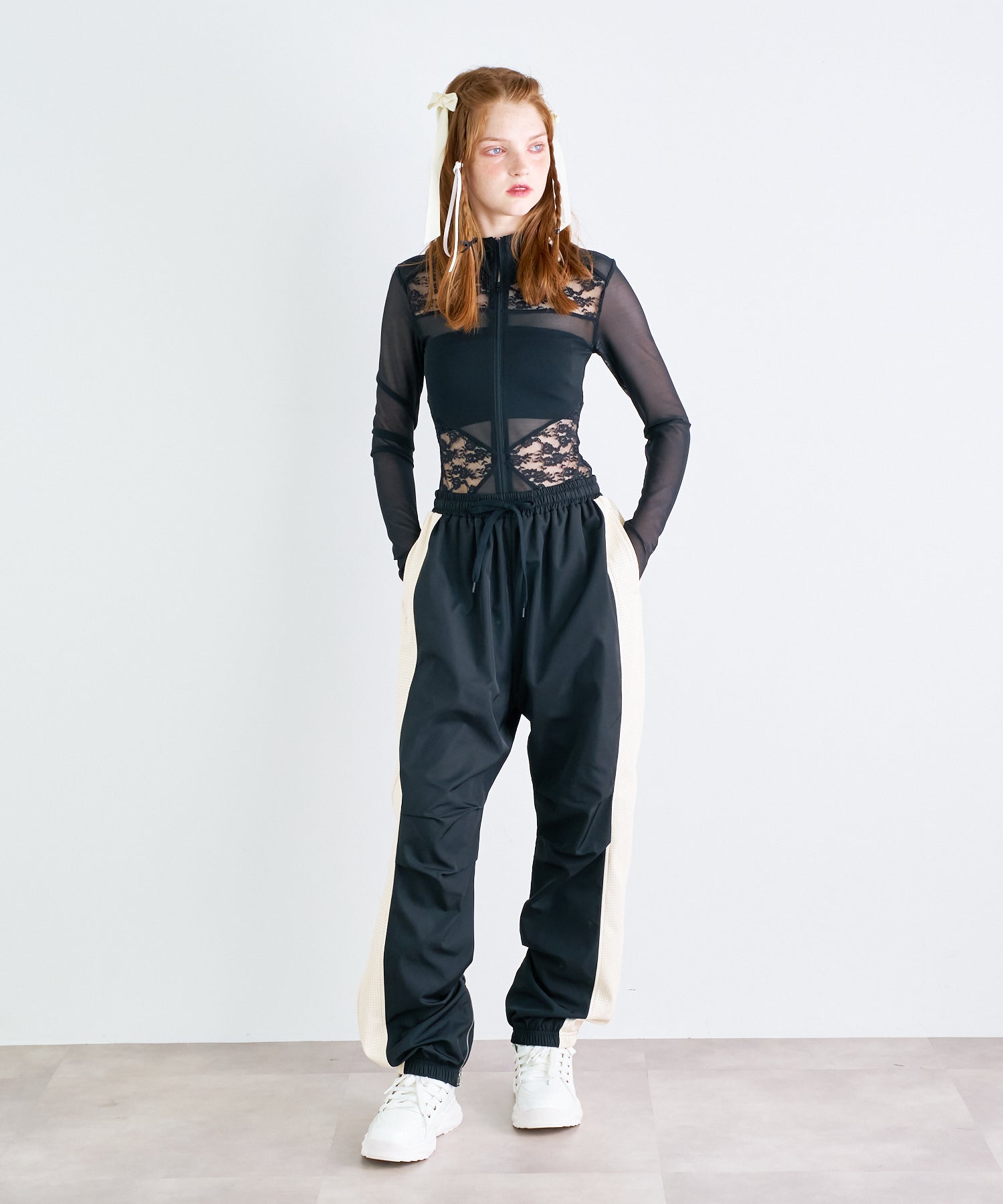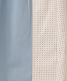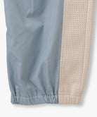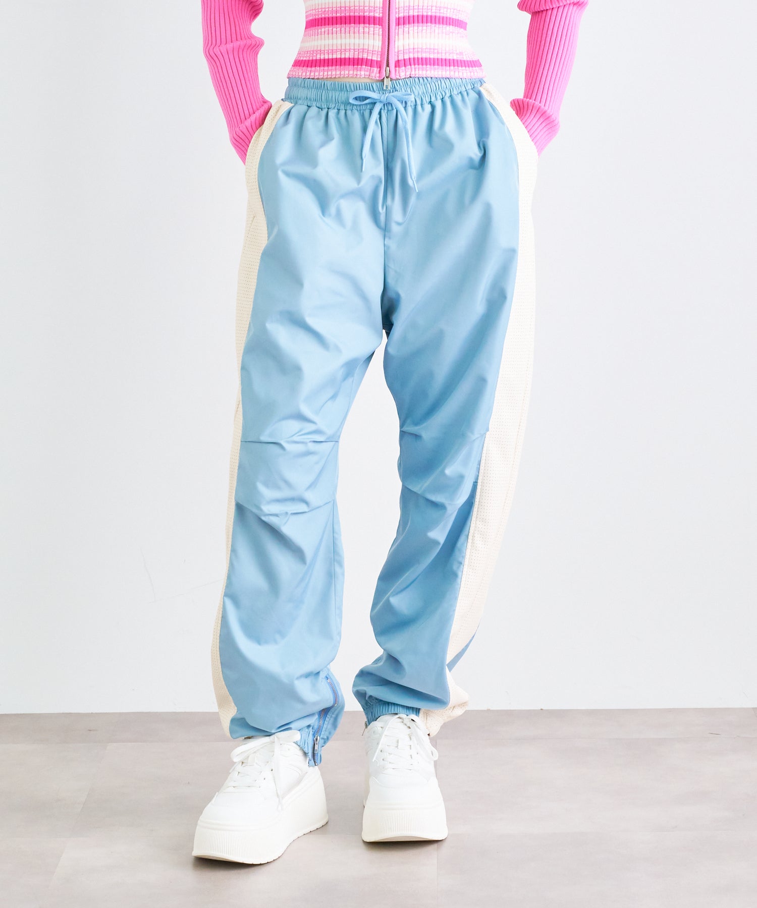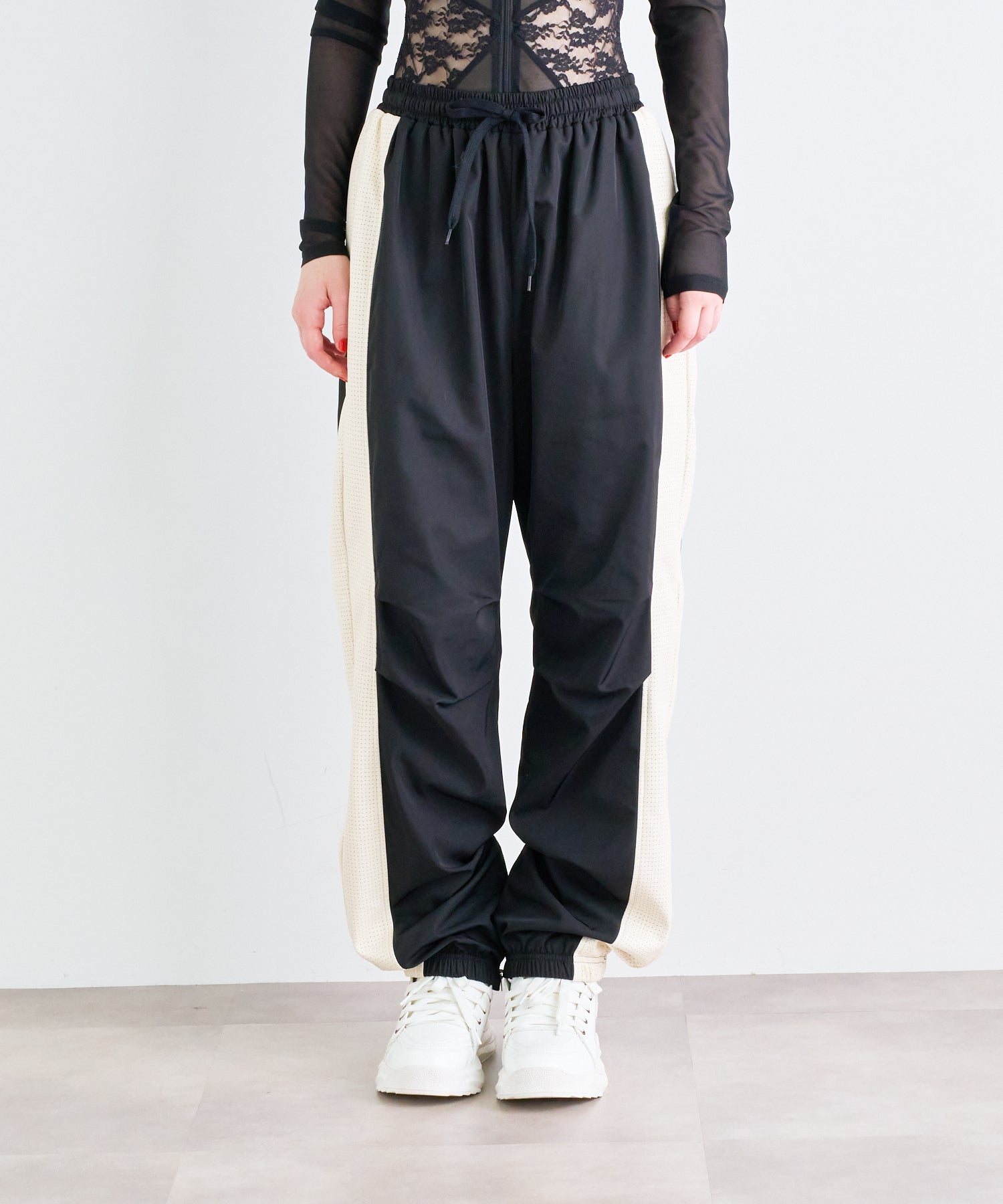 全体には上品な光沢があるツイル素材を使用し、サイドにはドットの穴が空いたパンチングレザー生地を使いました。中にはメッシュ裏地を付けているため、まだ少し暑さの残る秋口にもムレ感なく着用いただける履き心地のいいパンツです。裾のファスナーを開けて着用すると裏地の配色メッシュがのぞき込み、一味違ったスタイリングを楽しむことができます。