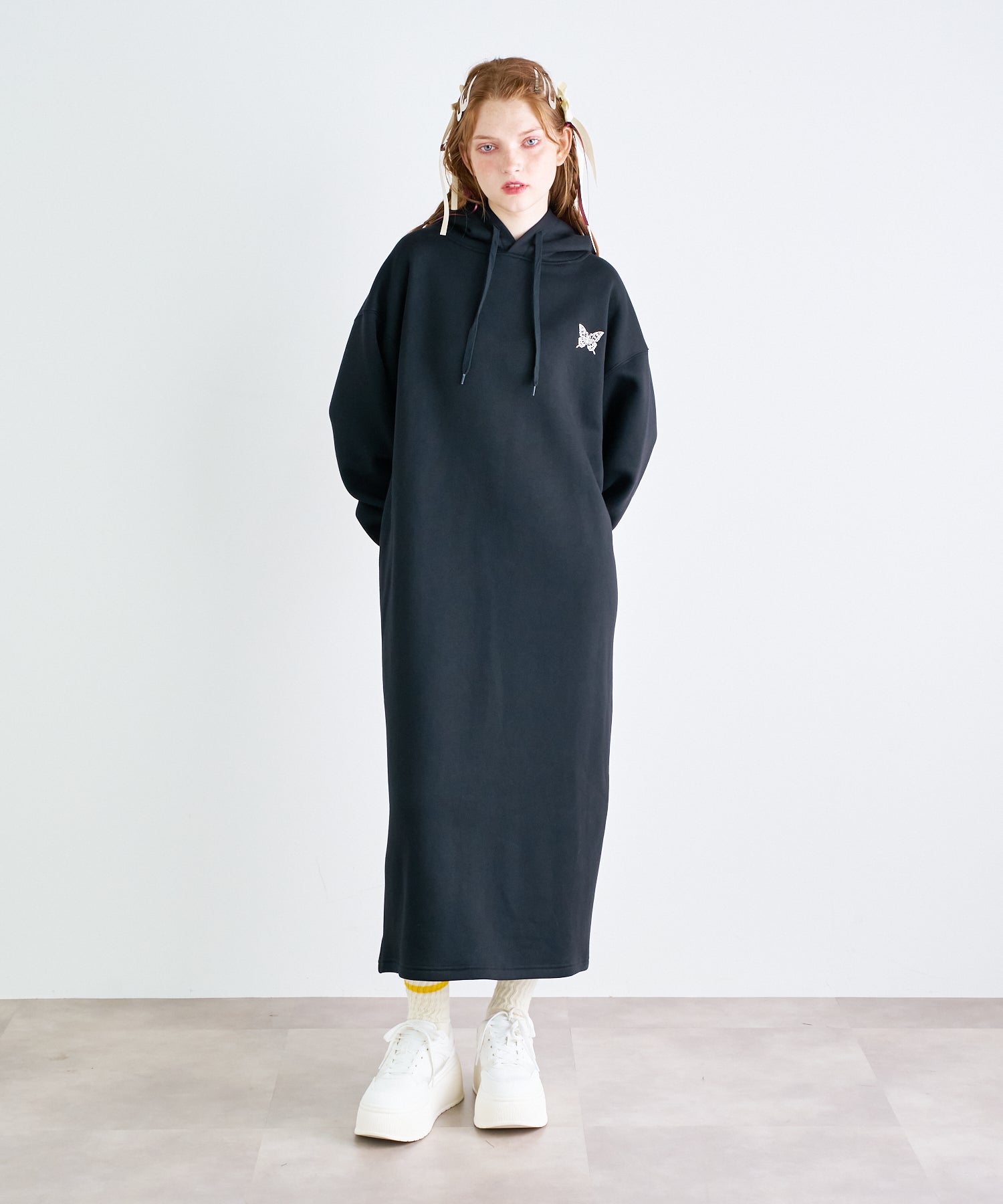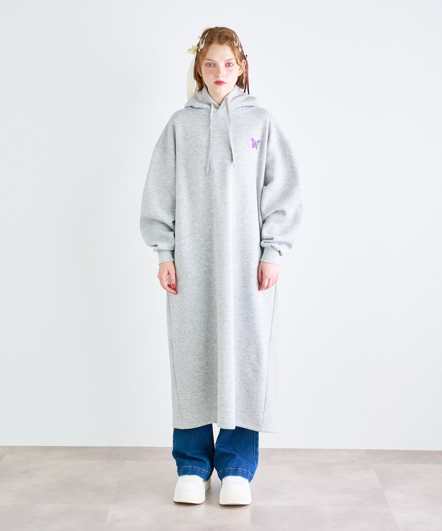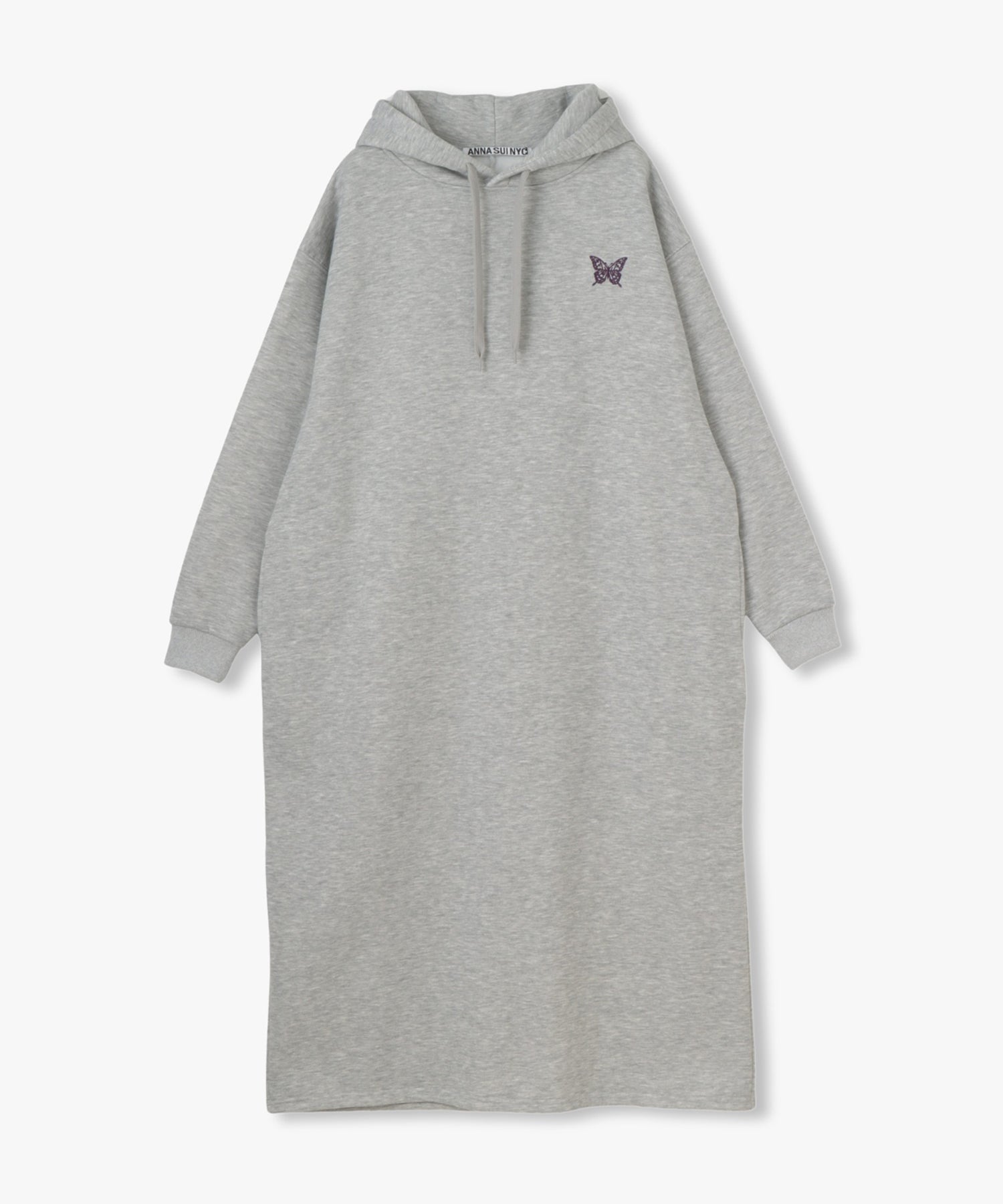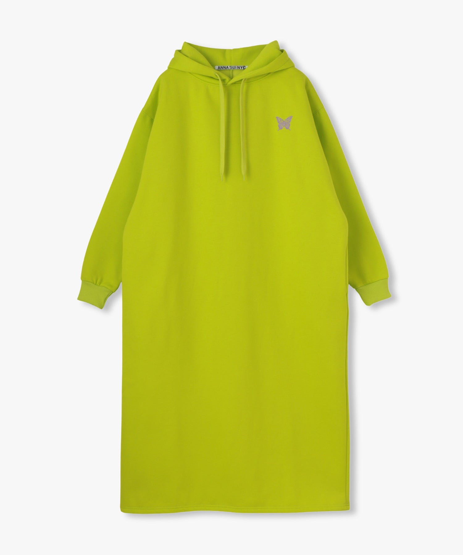 柔らかくもっちりとした裏起毛のワンピースはオーバーサイズシルエットで、全体を暖かく包み込んでくれます。フードも付いておりボリューム感ありシンプルなデザインながらも存在感のあるワンピースです。胸元の ANNA SUI NYC の蝶々モチーフ刺繍がかわいい今期ヘビロテ間違いなしのイチオシアイテムです。