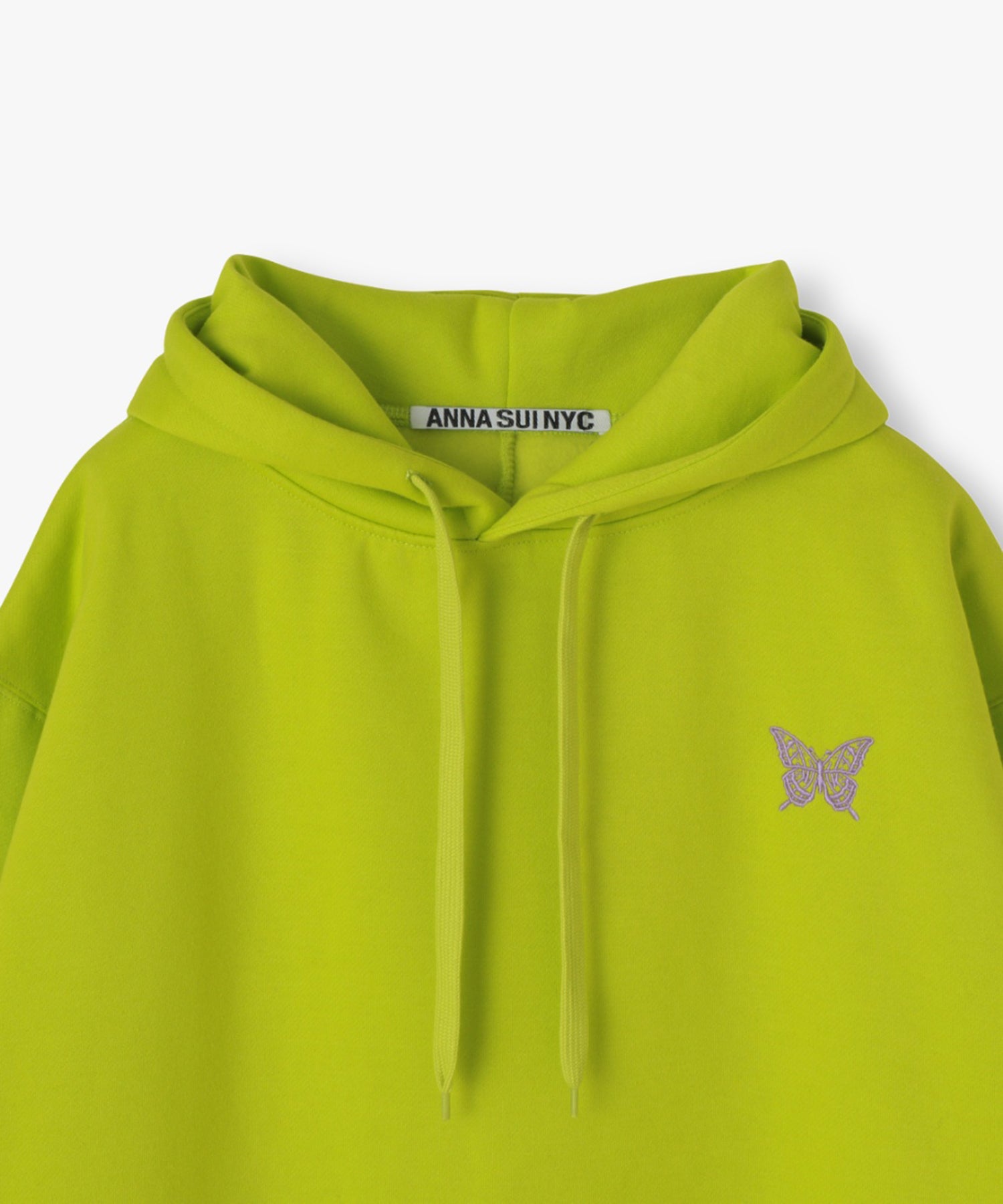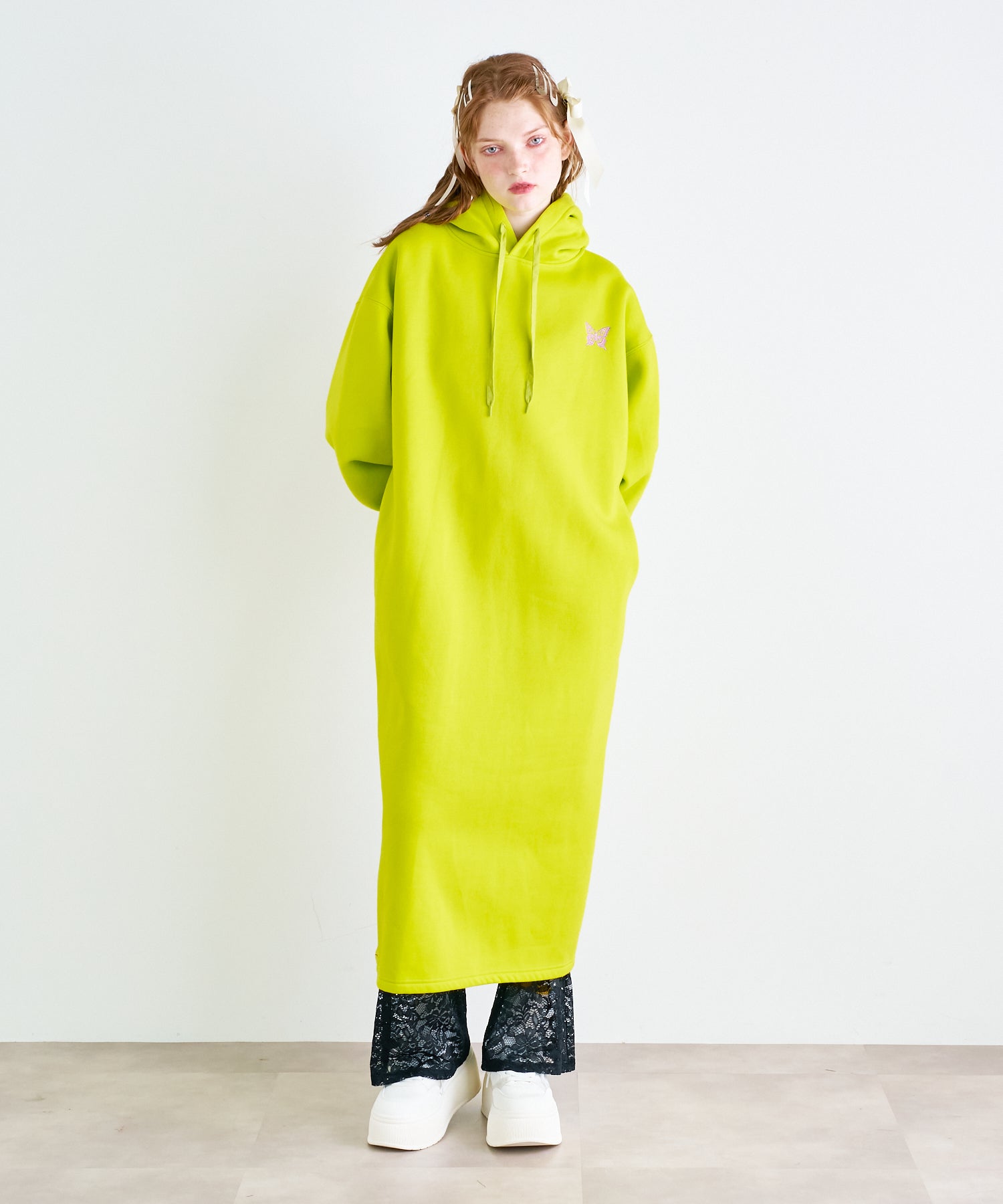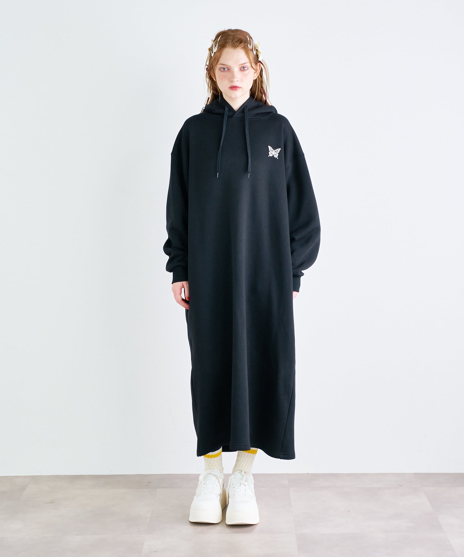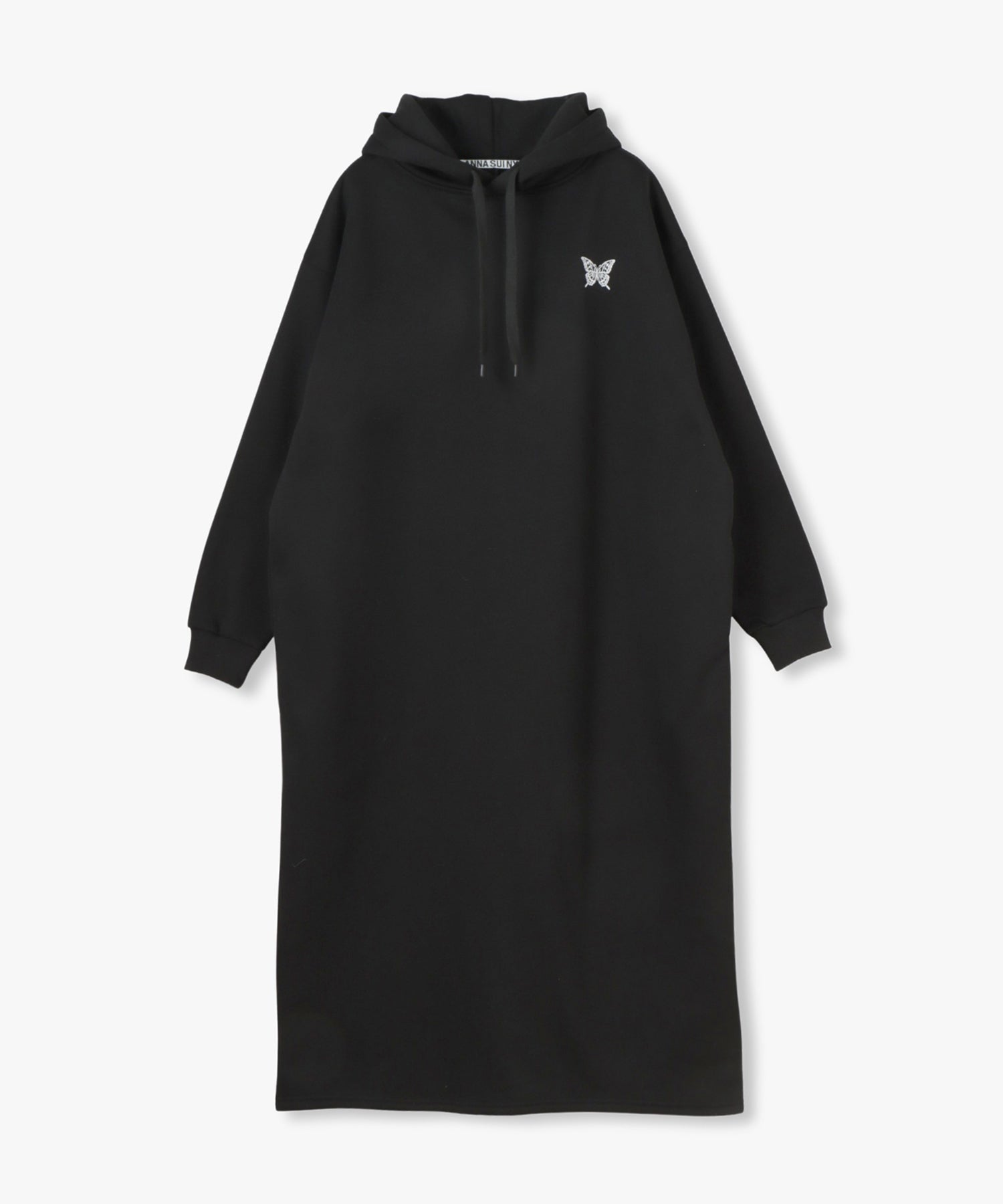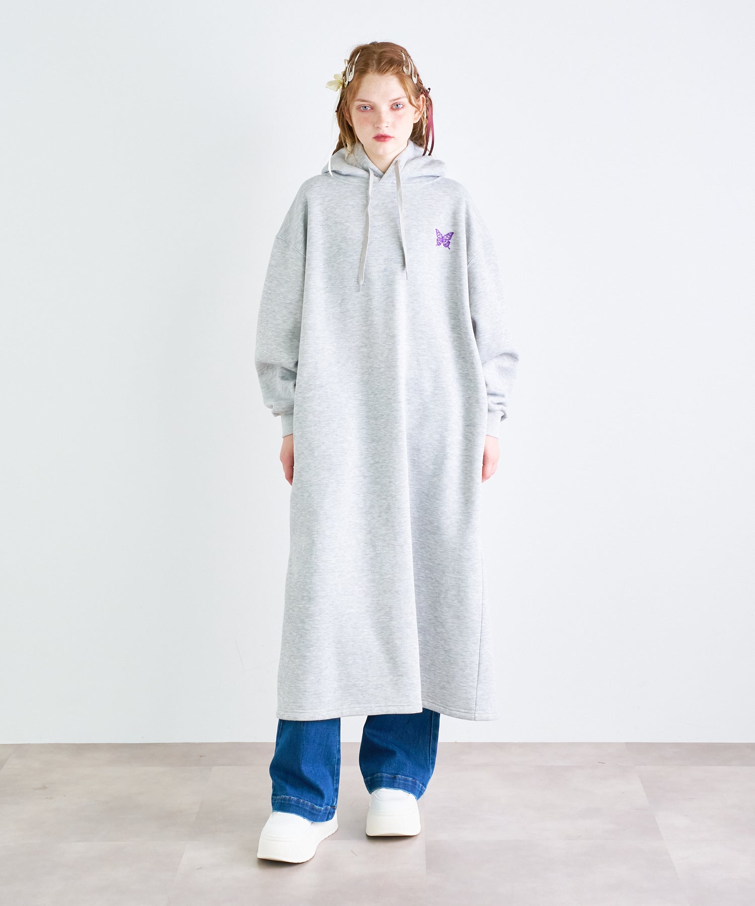柔らかくもっちりとした裏起毛のワンピースはオーバーサイズシルエットで、全体を暖かく包み込んでくれます。フードも付いておりボリューム感ありシンプルなデザインながらも存在感のあるワンピースです。胸元の ANNA SUI NYC の蝶々モチーフ刺繍がかわいい今期ヘビロテ間違いなしのイチオシアイテムです。