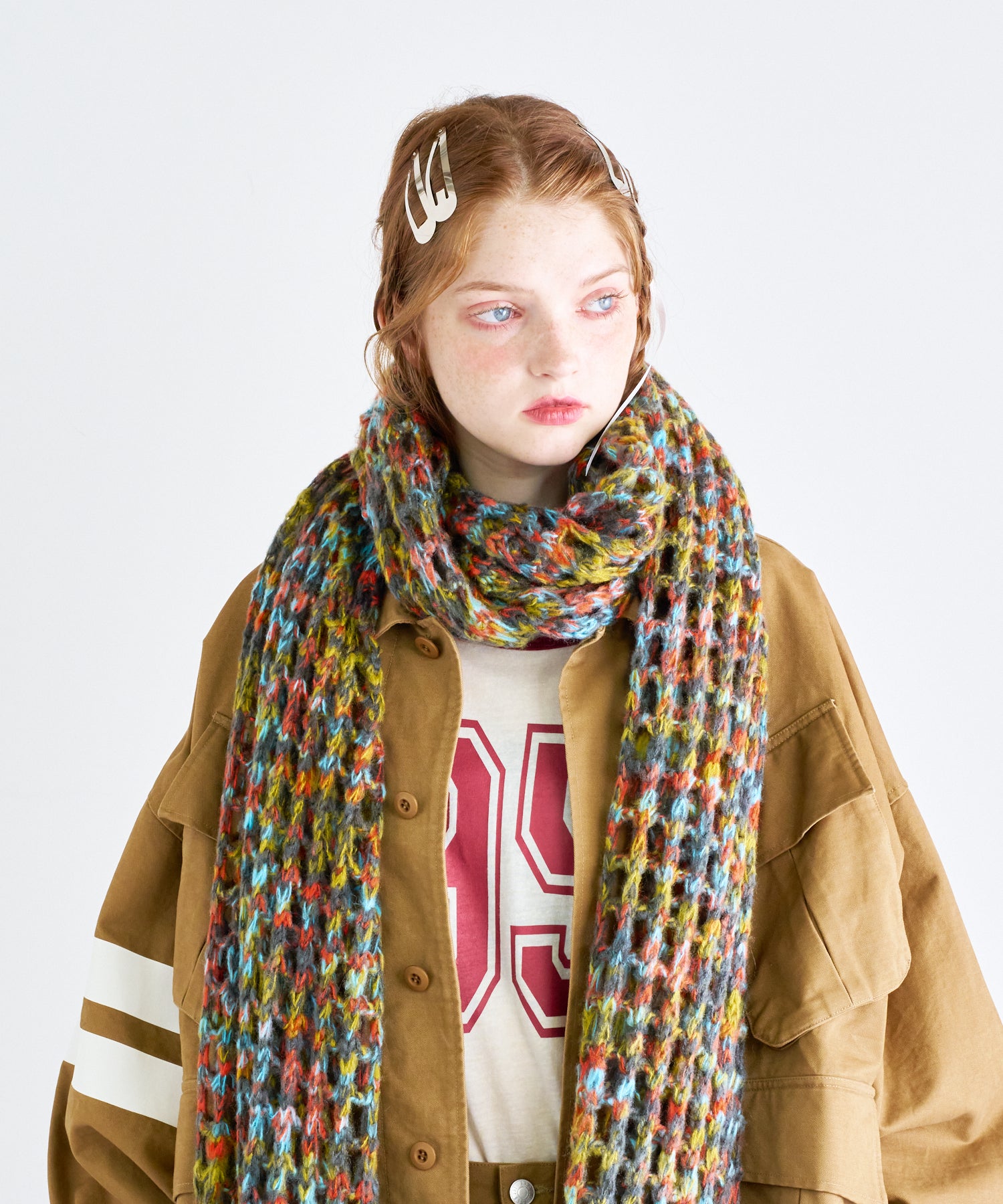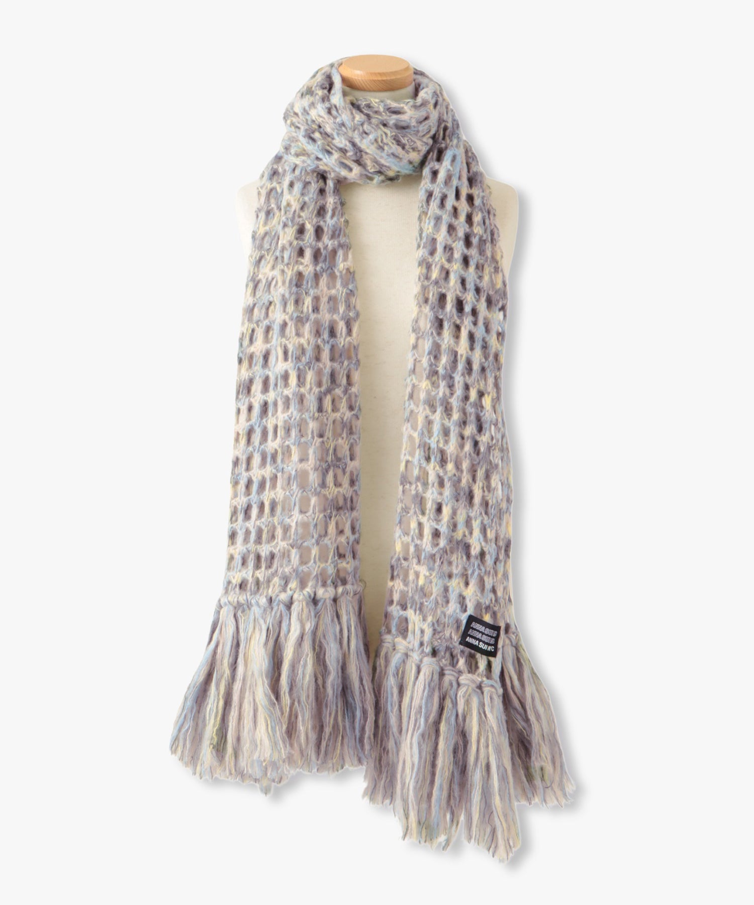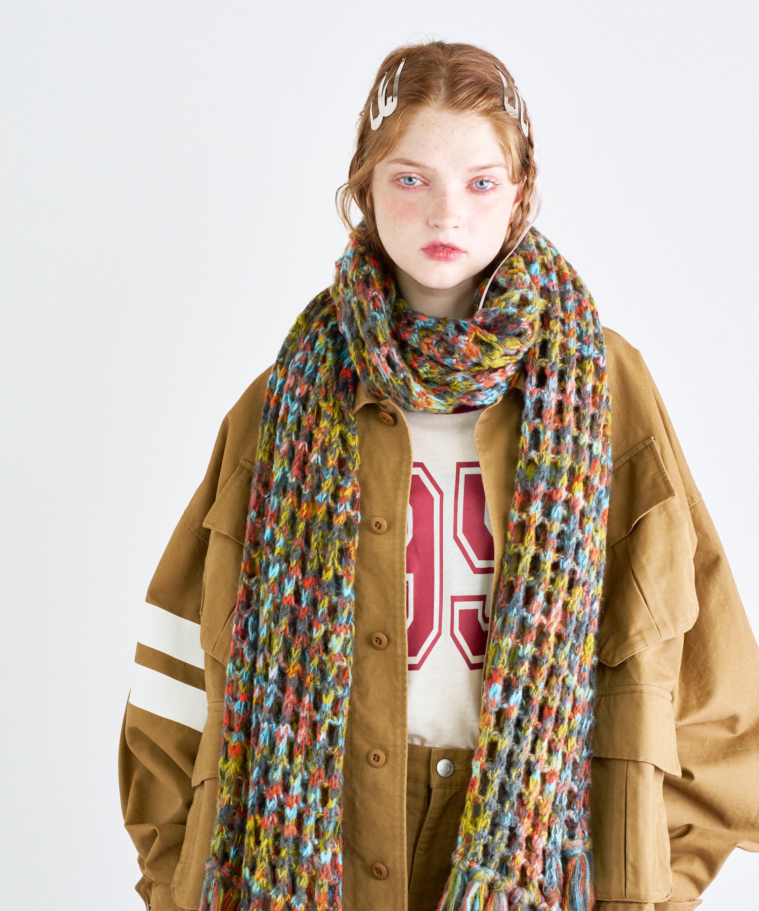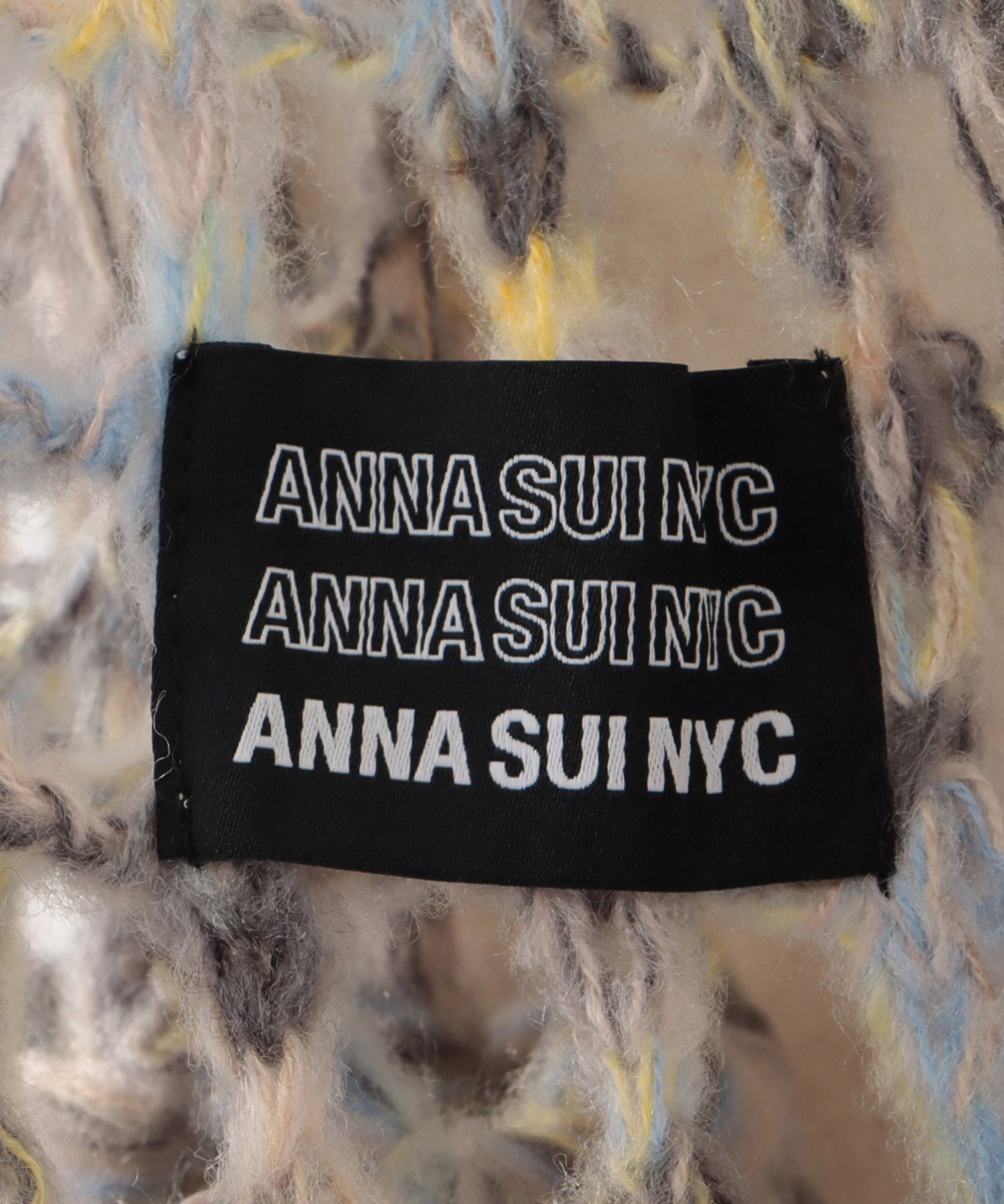 ミックスカラーがスタイリング映えする今季一押しのアイテム。カラーによって雰囲気が異なるので自分に合うカラーを見つけていただけます。ボリューム感たっぷりのシルエットと抜け感のある格子編みのコントラストがユニークなマフラーは他では出会えないANNA SUI NYCらしいアイテムです。
