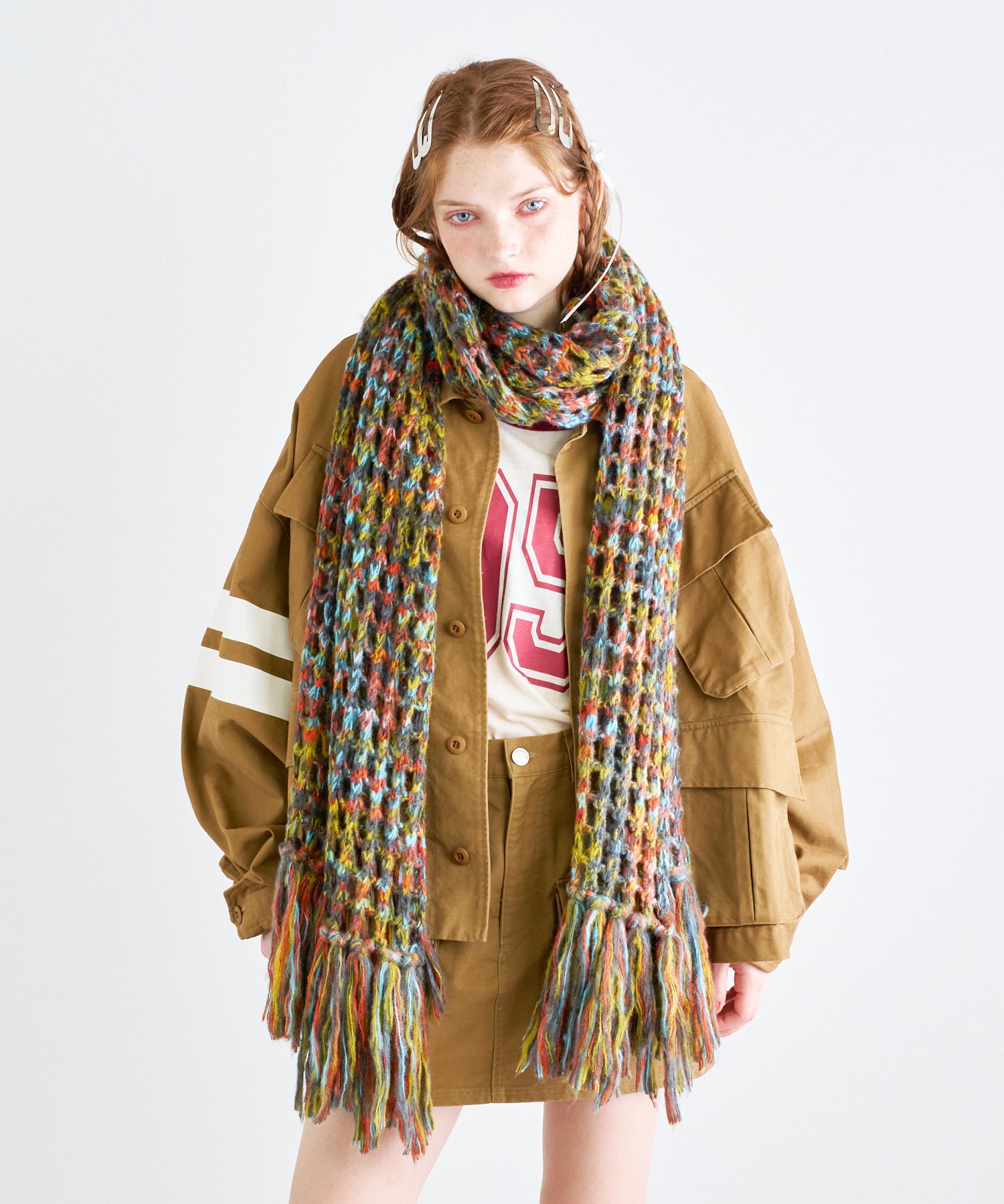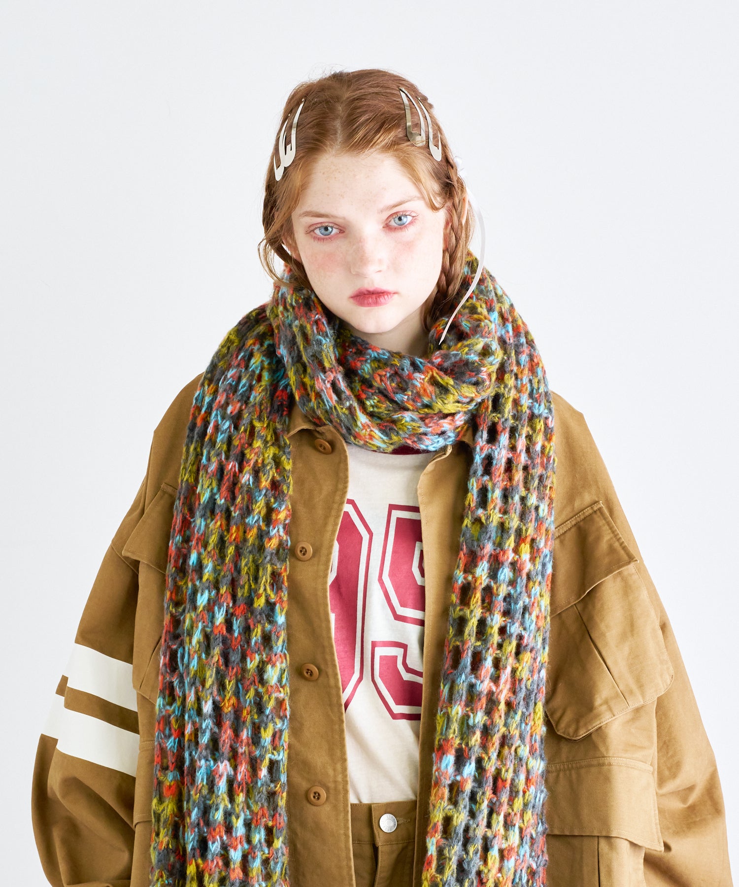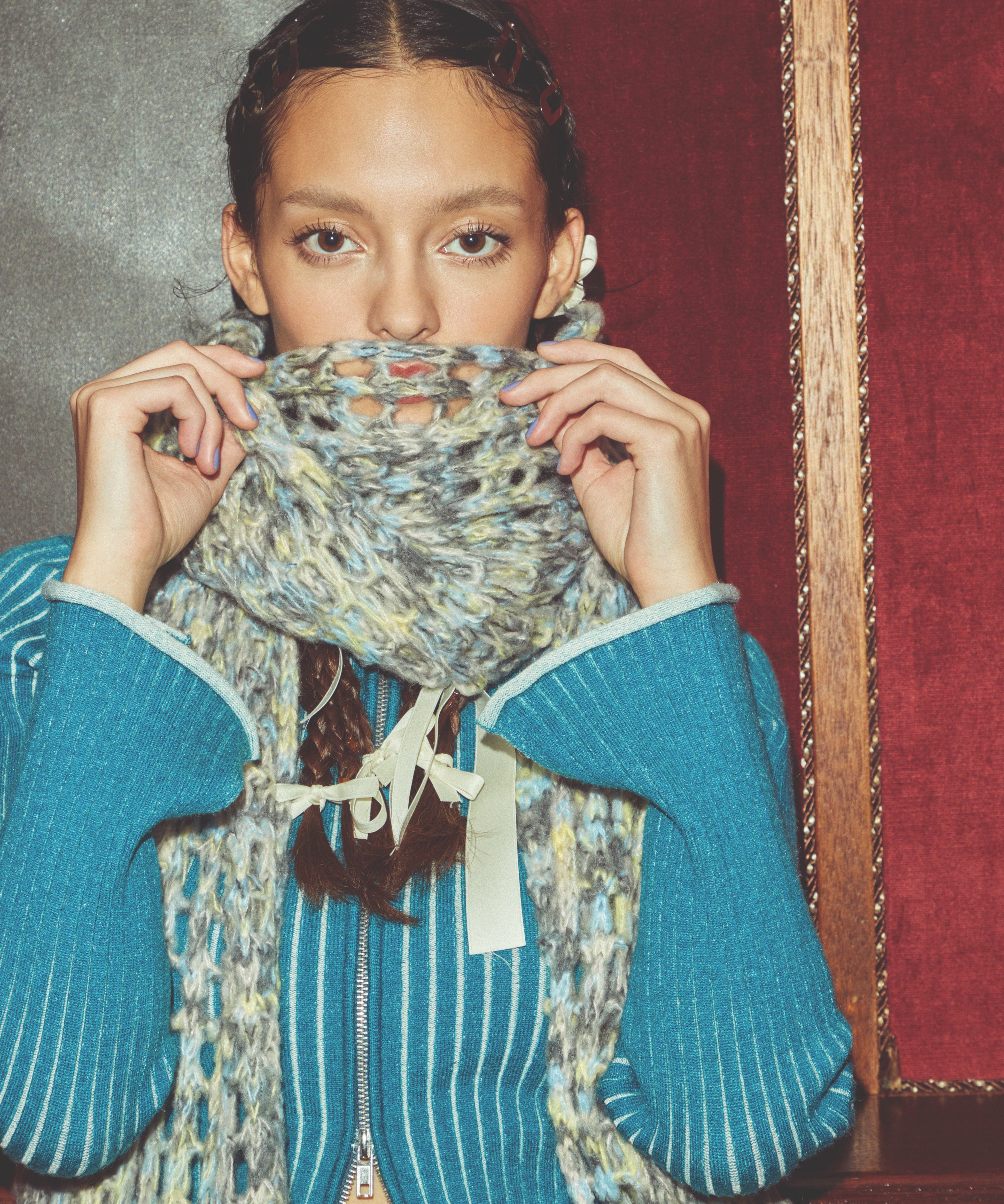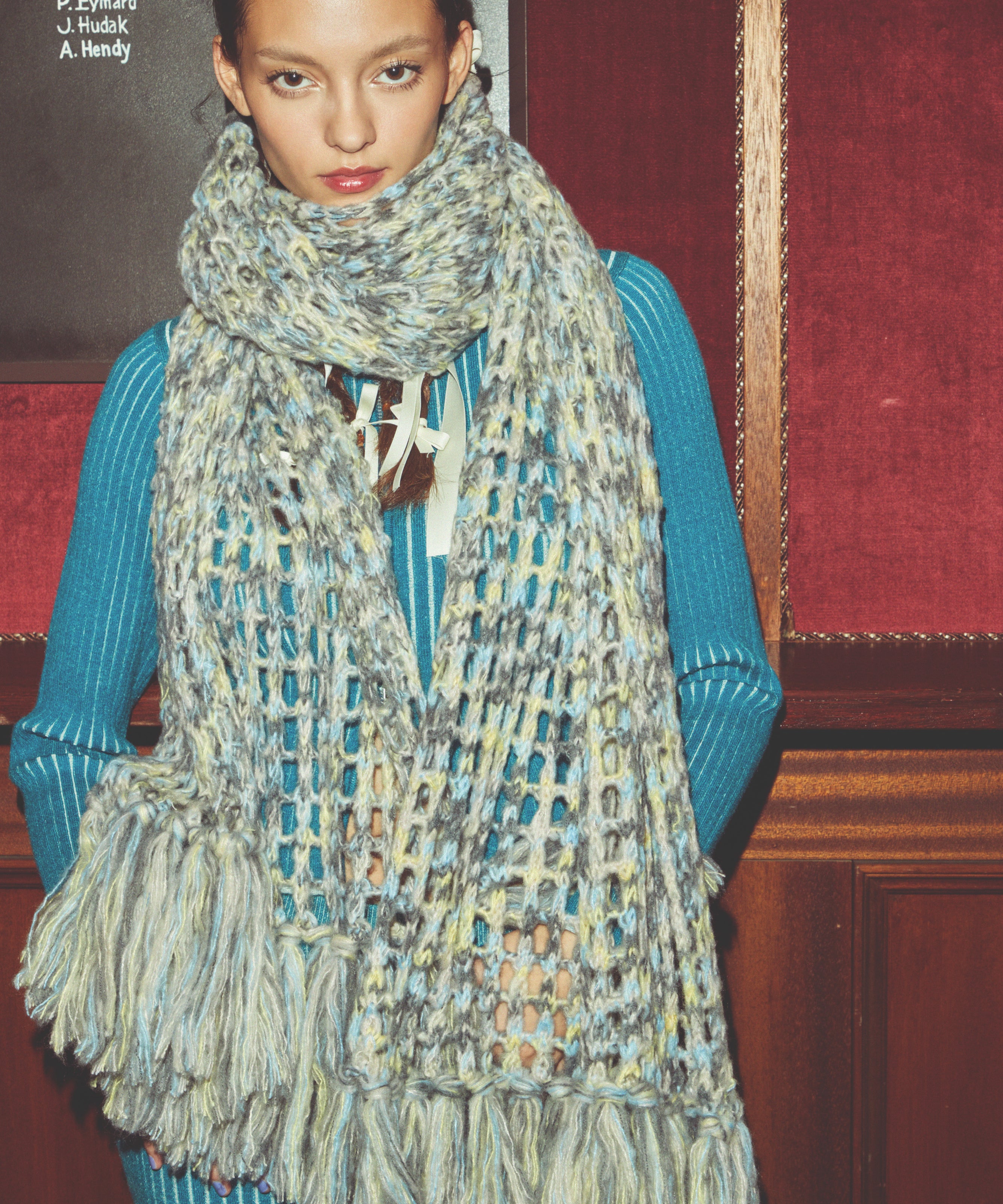 ミックスカラーがスタイリング映えする今季一押しのアイテム。カラーによって雰囲気が異なるので自分に合うカラーを見つけていただけます。ボリューム感たっぷりのシルエットと抜け感のある格子編みのコントラストがユニークなマフラーは他では出会えないANNA SUI NYCらしいアイテムです。