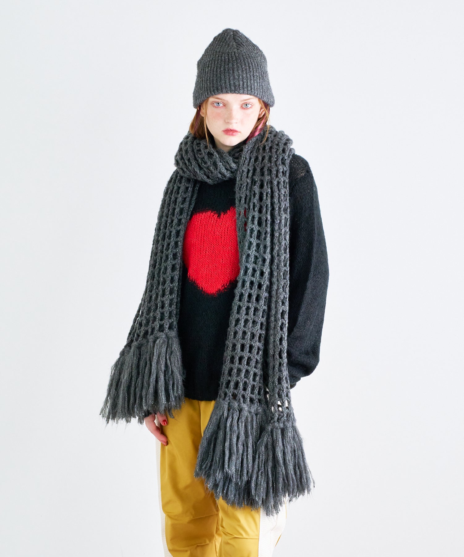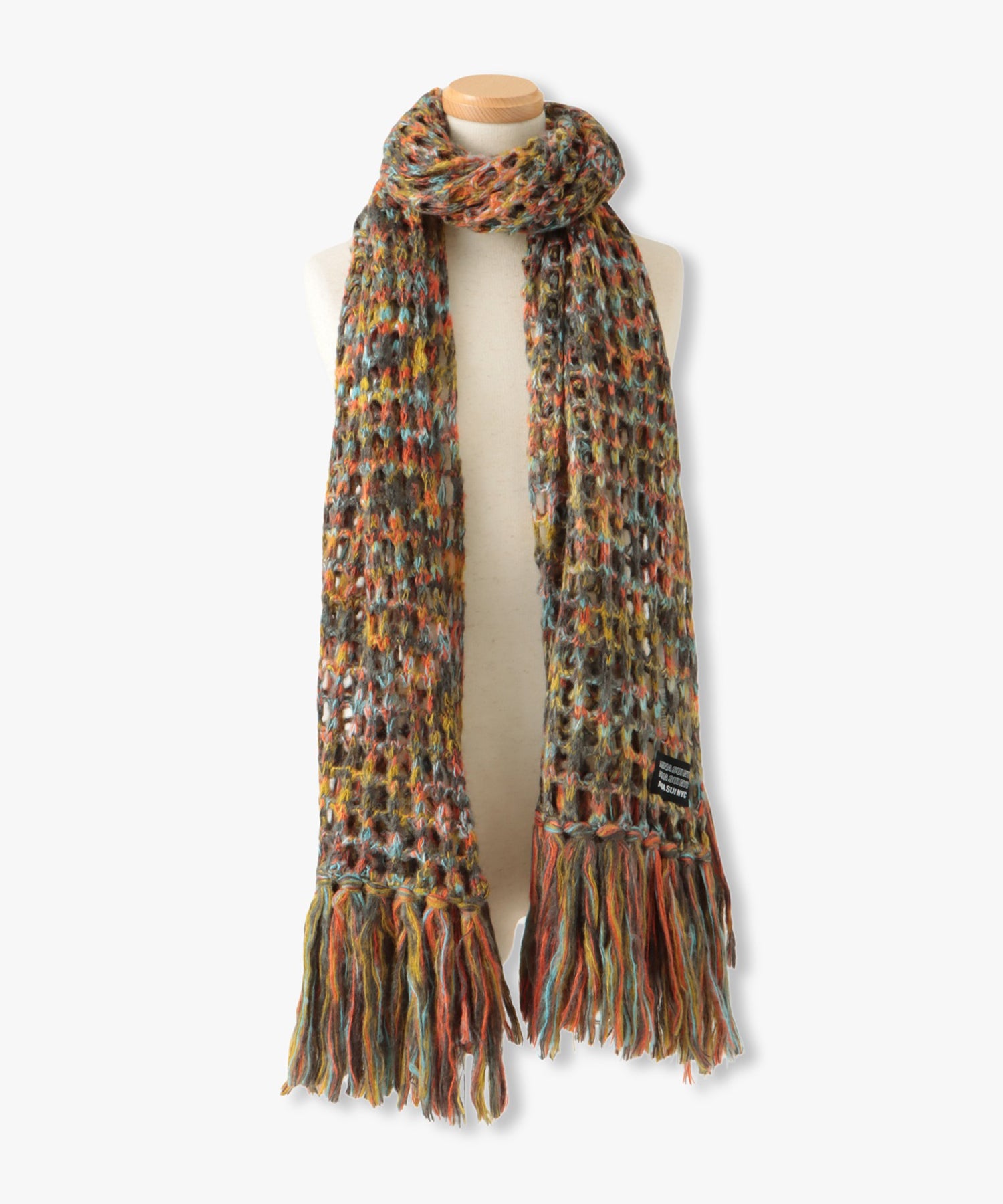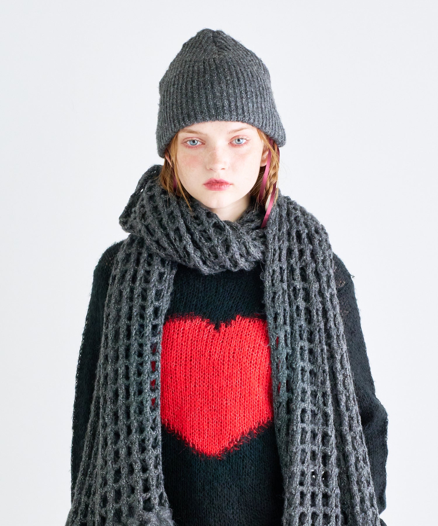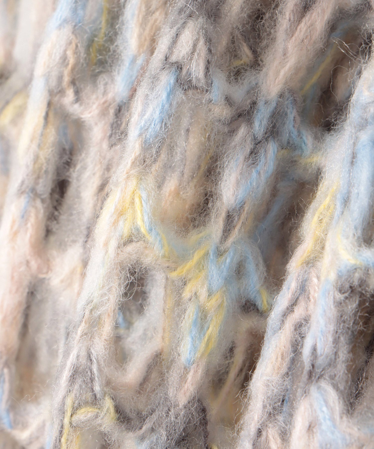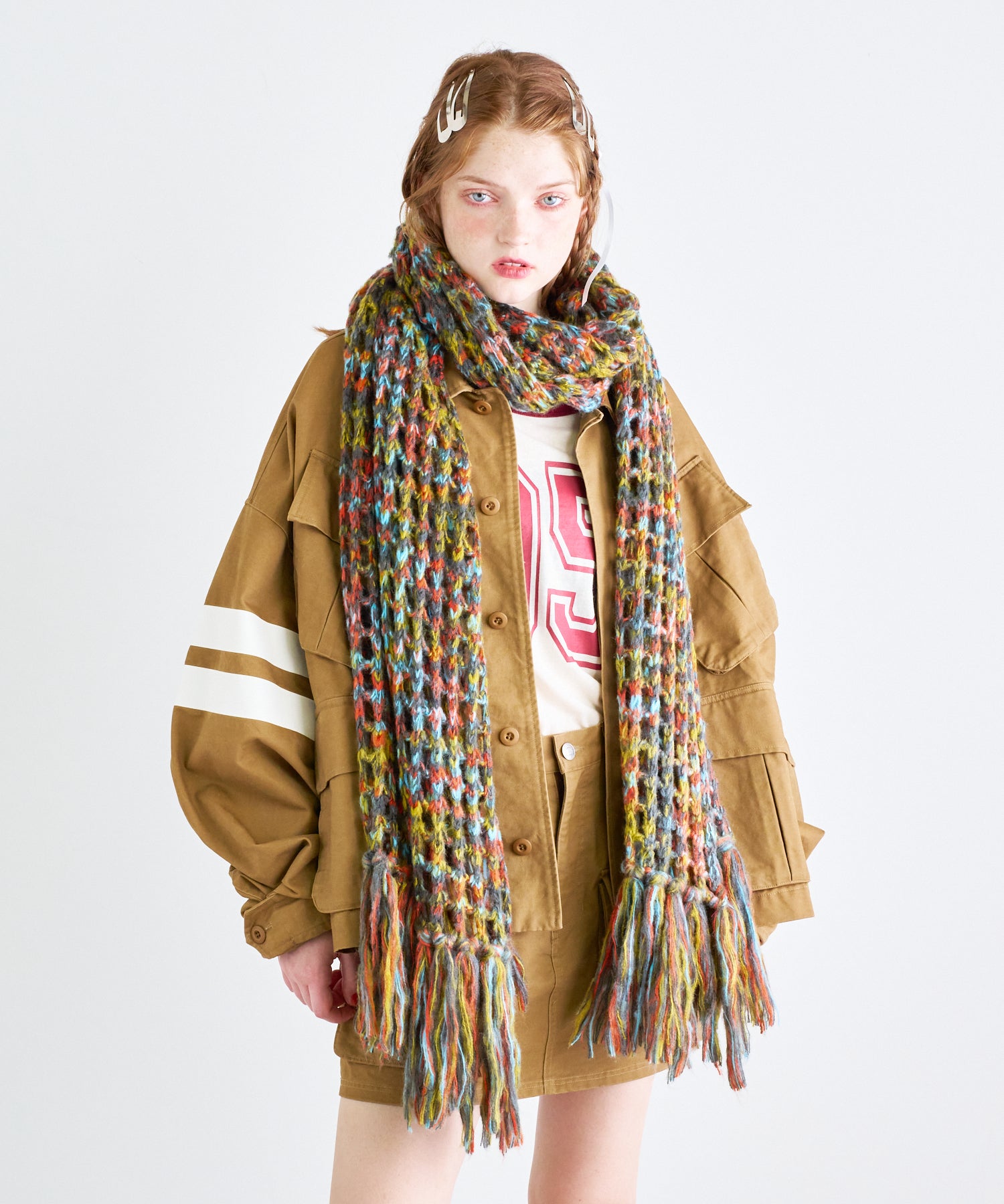 ミックスカラーがスタイリング映えする今季一押しのアイテム。カラーによって雰囲気が異なるので自分に合うカラーを見つけていただけます。ボリューム感たっぷりのシルエットと抜け感のある格子編みのコントラストがユニークなマフラーは他では出会えないANNA SUI NYCらしいアイテムです。
