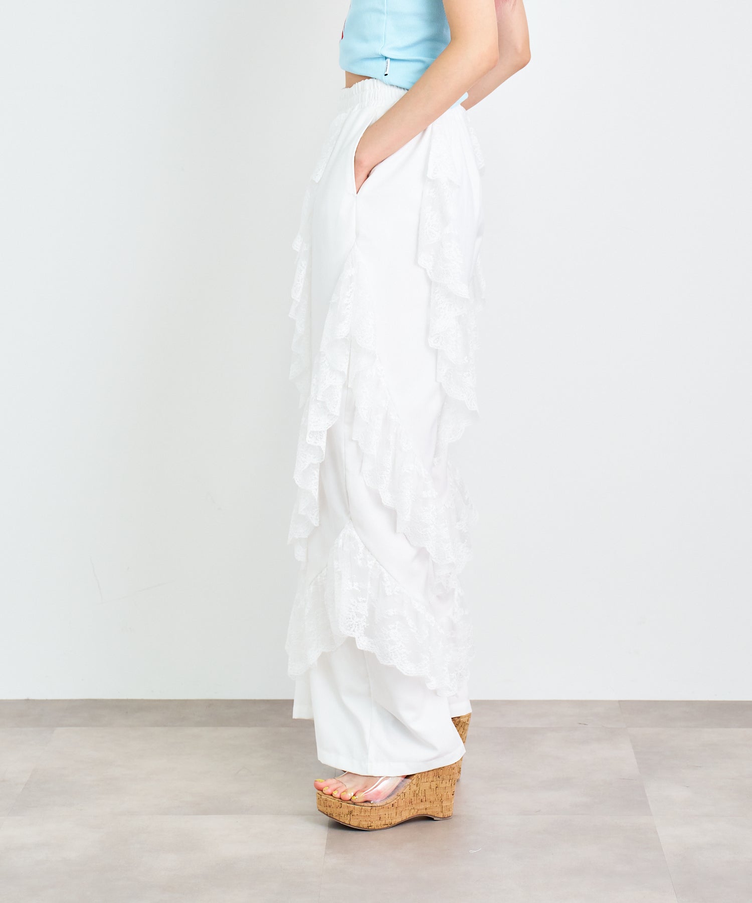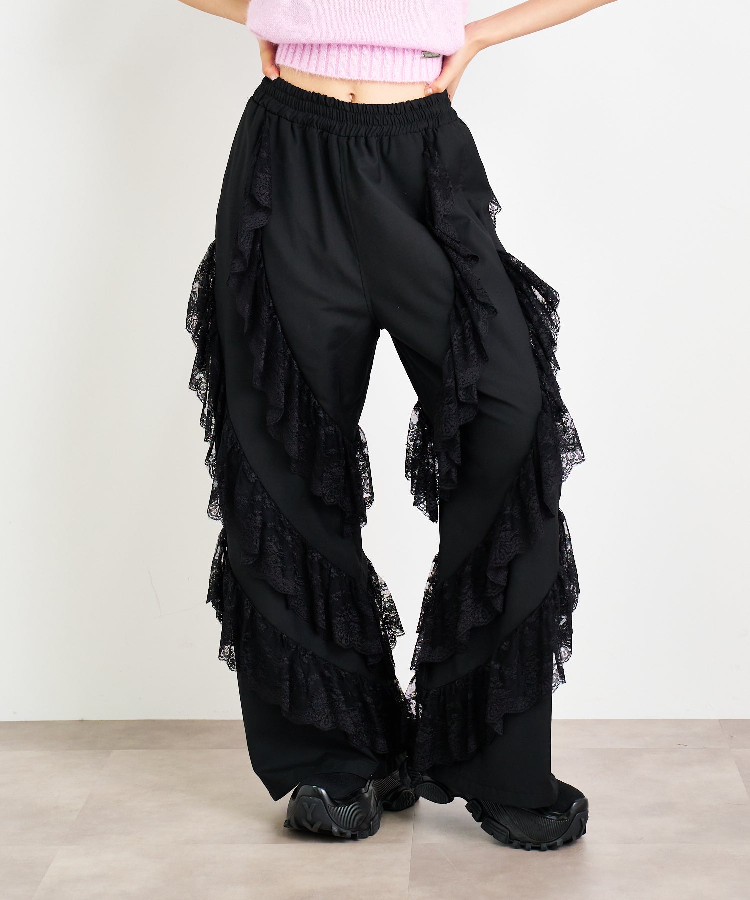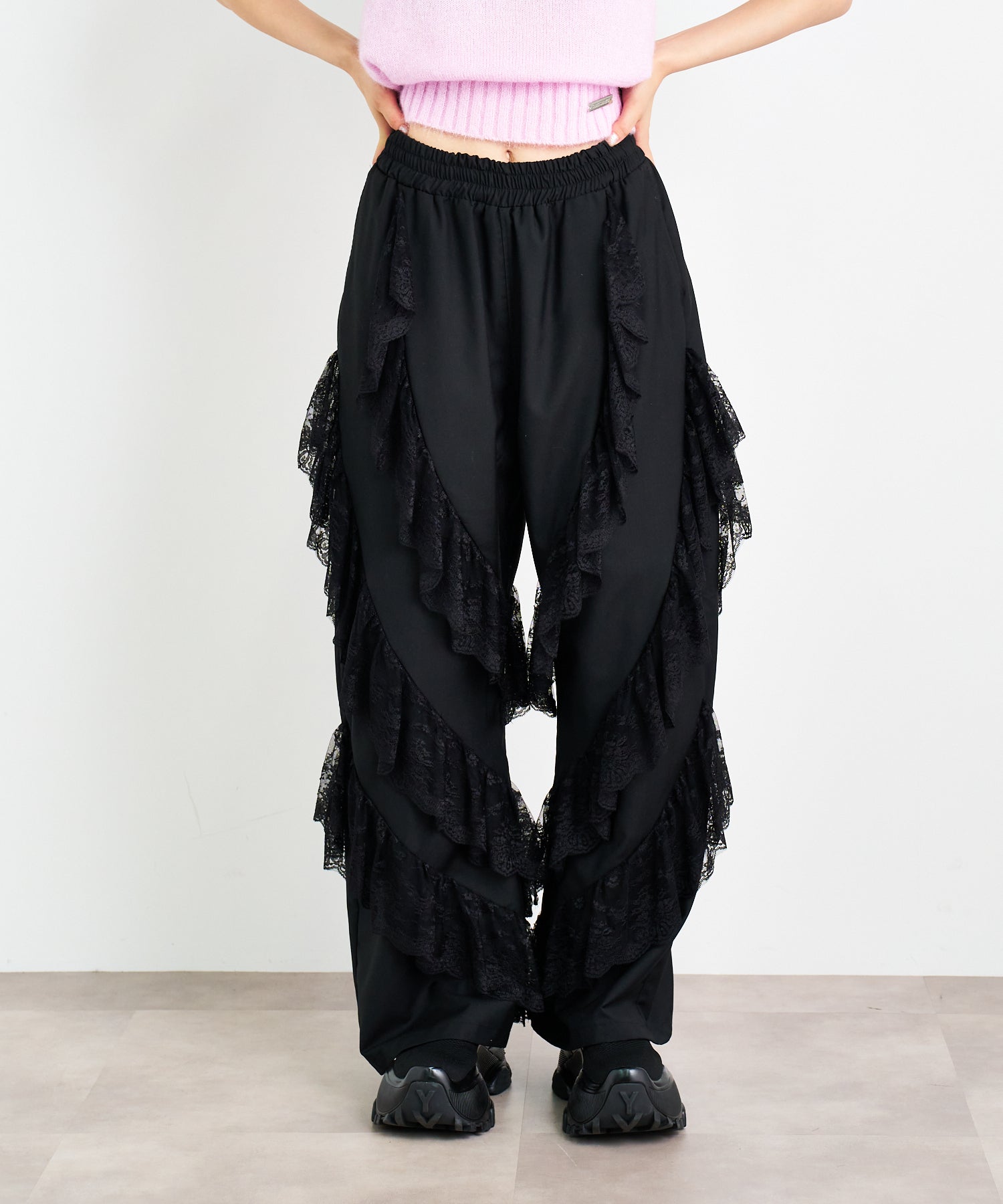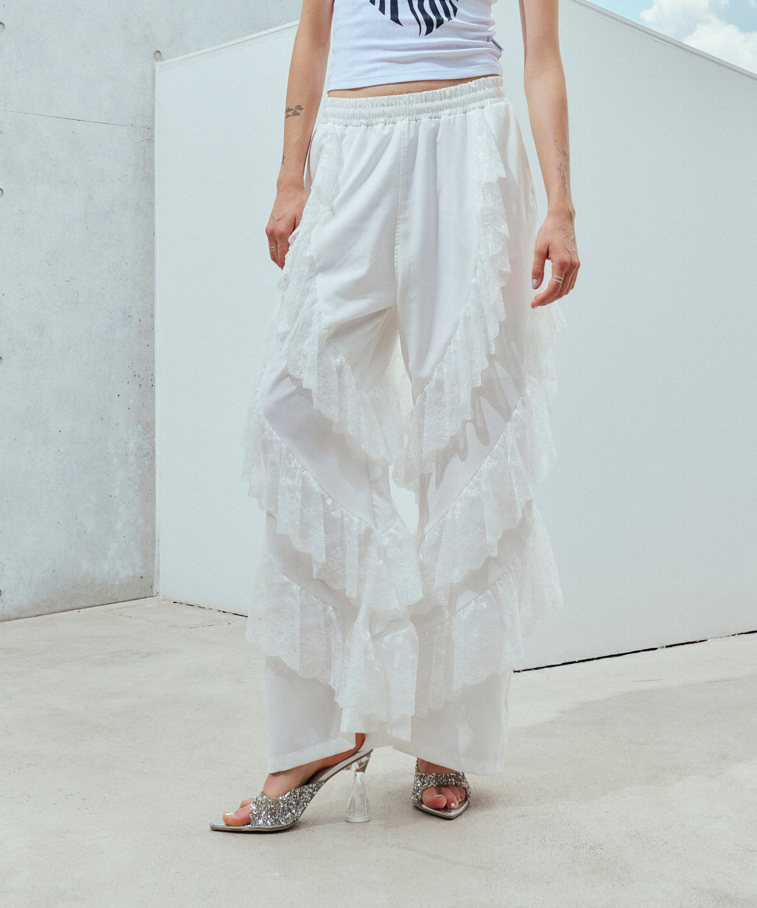 ワイドなシルエットに沿って流れるように施されたレース切り替えが、存在感を放つデザインパンツ。歩くたびにドラマティックに揺れるレースは縫い付けではなく、ひと手間かかる“切り替え”で構成することで、美しいラインを追求。動きの中に繊細な表情が生まれ、どの角度からも視線を惹きつけます。ウエストはゴム仕様で、快適な穿き心地も叶える一着。デザイン性と仕立ての丁寧さにこだわった、特別感のある一本です。