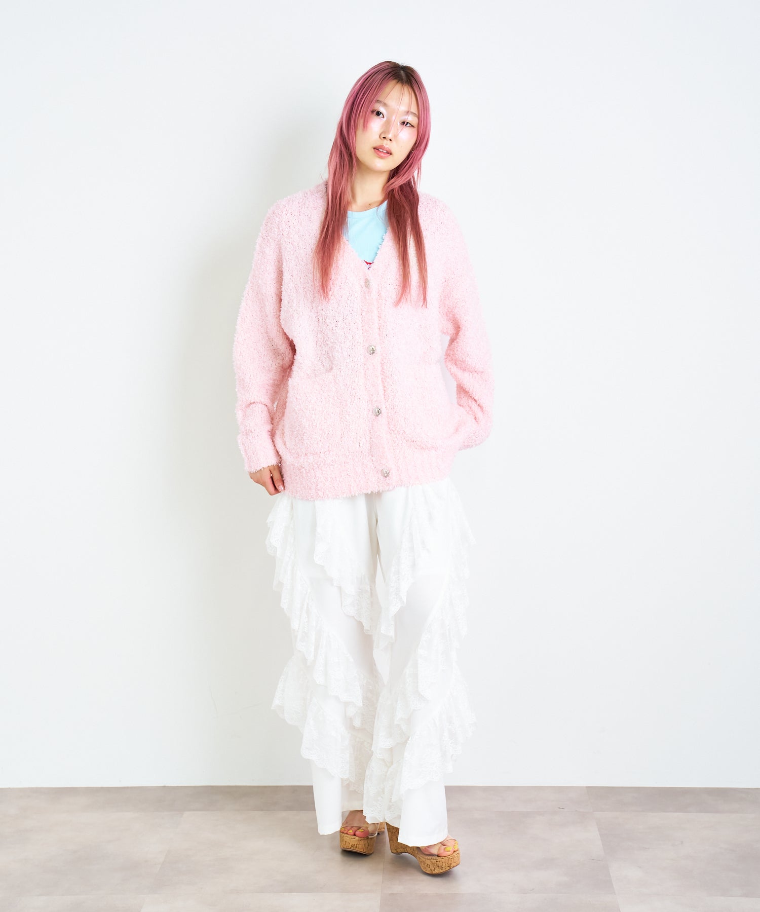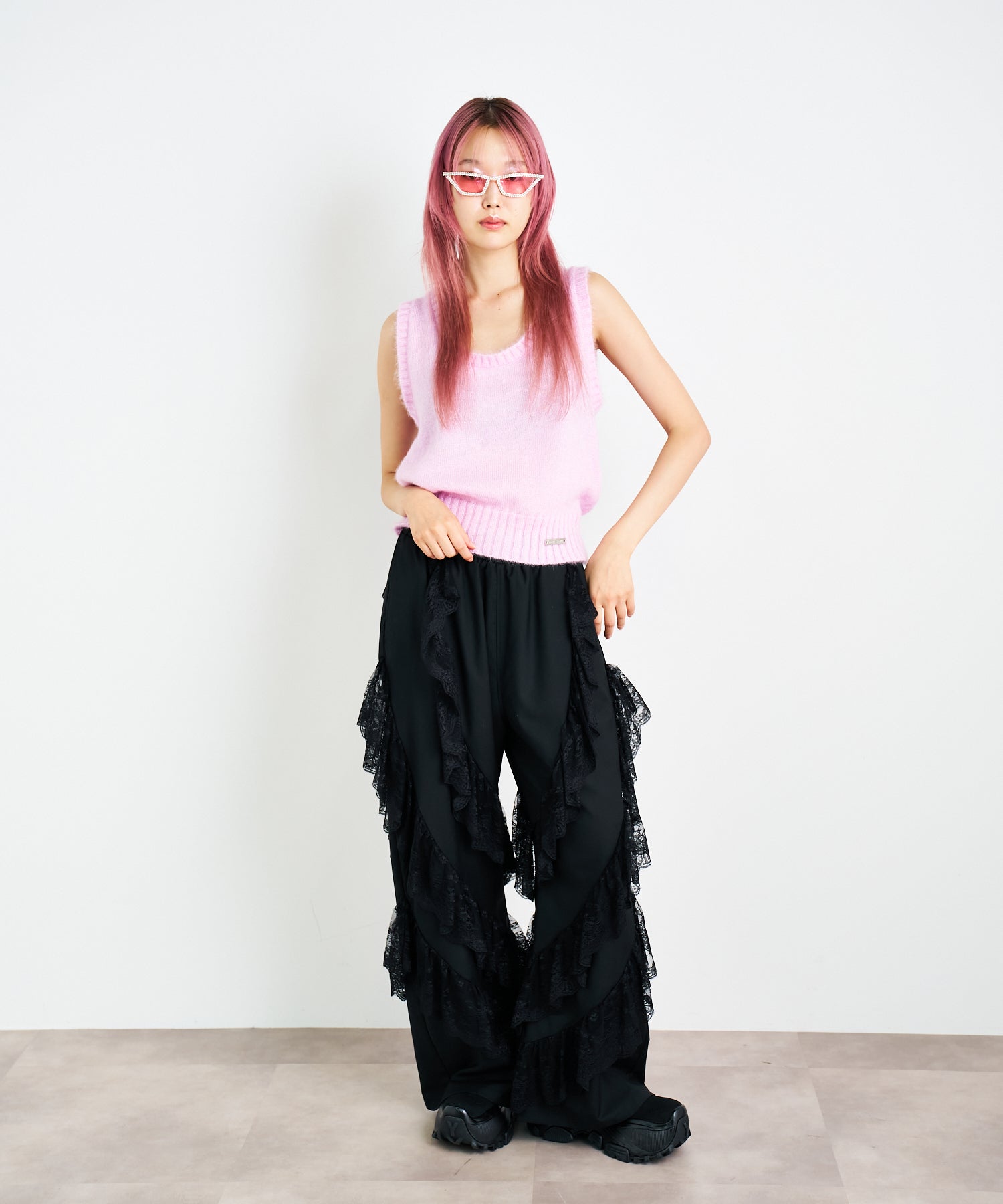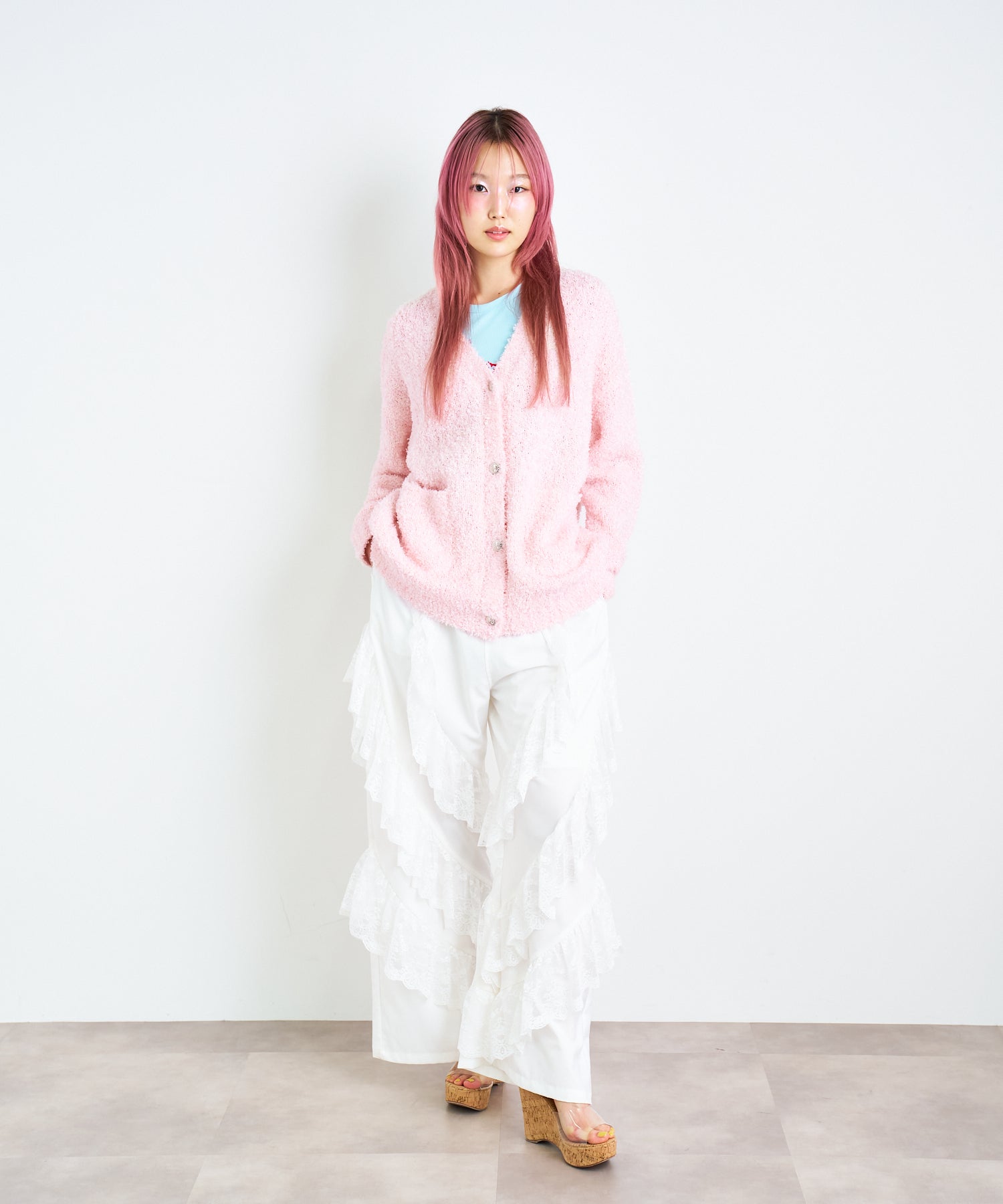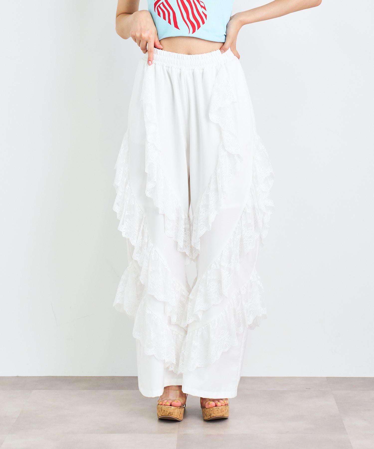 ワイドなシルエットに沿って流れるように施されたレース切り替えが、存在感を放つデザインパンツ。歩くたびにドラマティックに揺れるレースは縫い付けではなく、ひと手間かかる“切り替え”で構成することで、美しいラインを追求。動きの中に繊細な表情が生まれ、どの角度からも視線を惹きつけます。ウエストはゴム仕様で、快適な穿き心地も叶える一着。デザイン性と仕立ての丁寧さにこだわった、特別感のある一本です。