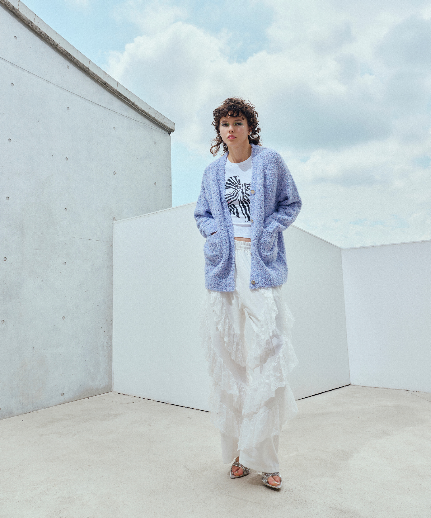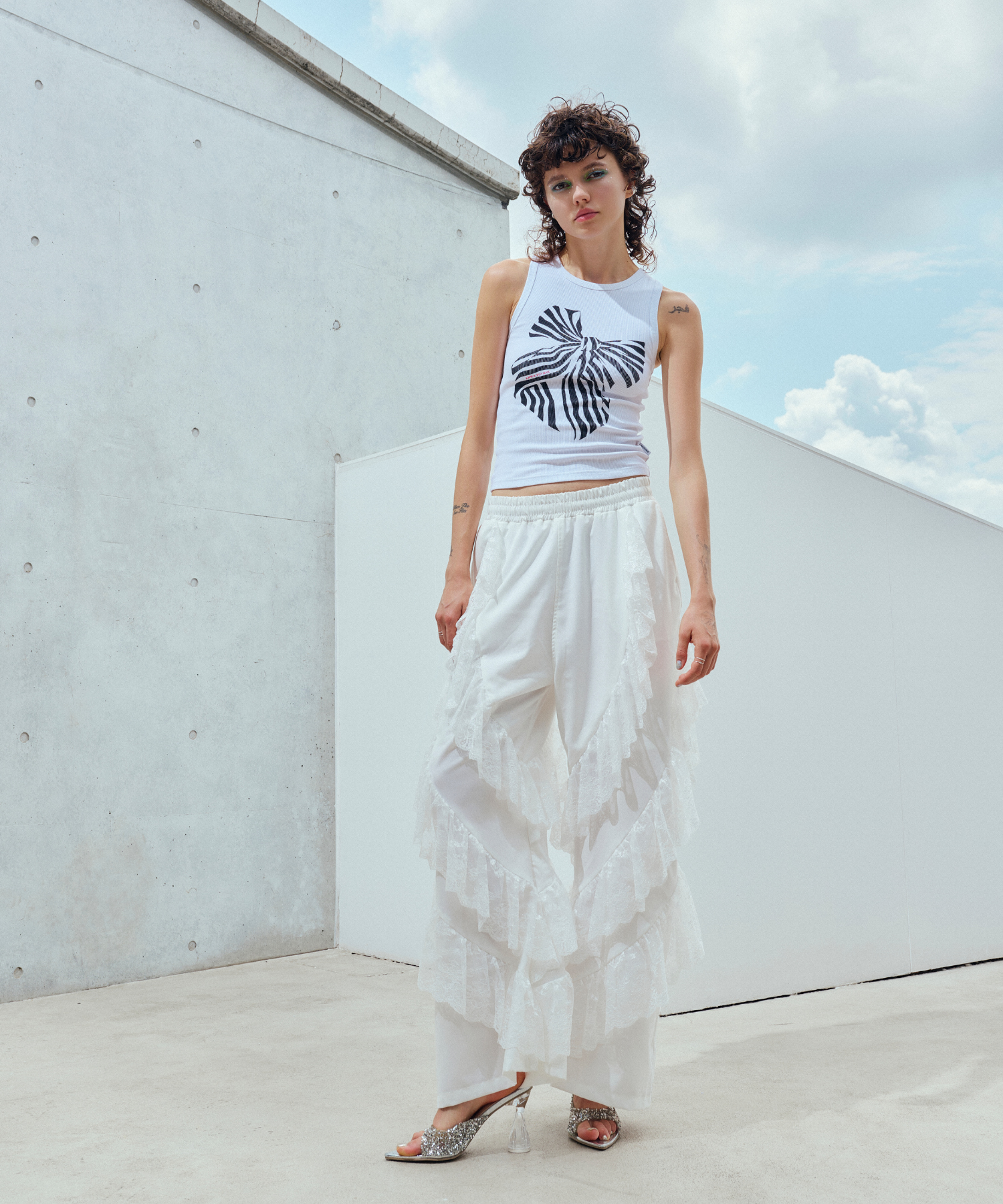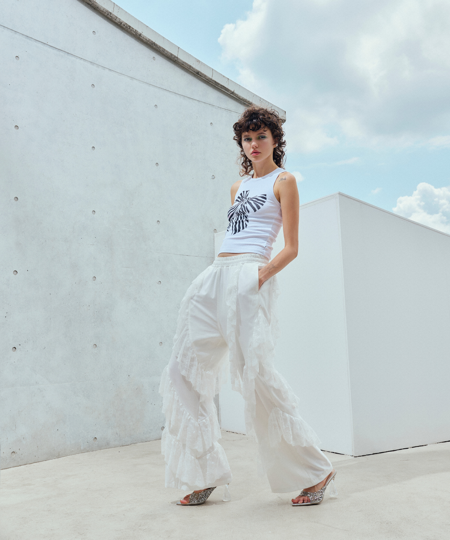 スタイリングの主役になるアイテムなので、あえてトップスはシンプルにまとめるのがおすすめ。コンパクトなTシャツやタンクを合わせれば、レースの甘さが程よく引き締まり、バランスの取れたスタイリングに。ワントーンでまとめたスタイリングも素材の美しさが引き立ち洗練された印象に仕上がります。ヒールを合わせてモードに、スニーカーで外してカジュアルダウンしても◎アクセサリーやヘアスタイルで振り幅を効かせられる、着回し力の高い一本です。