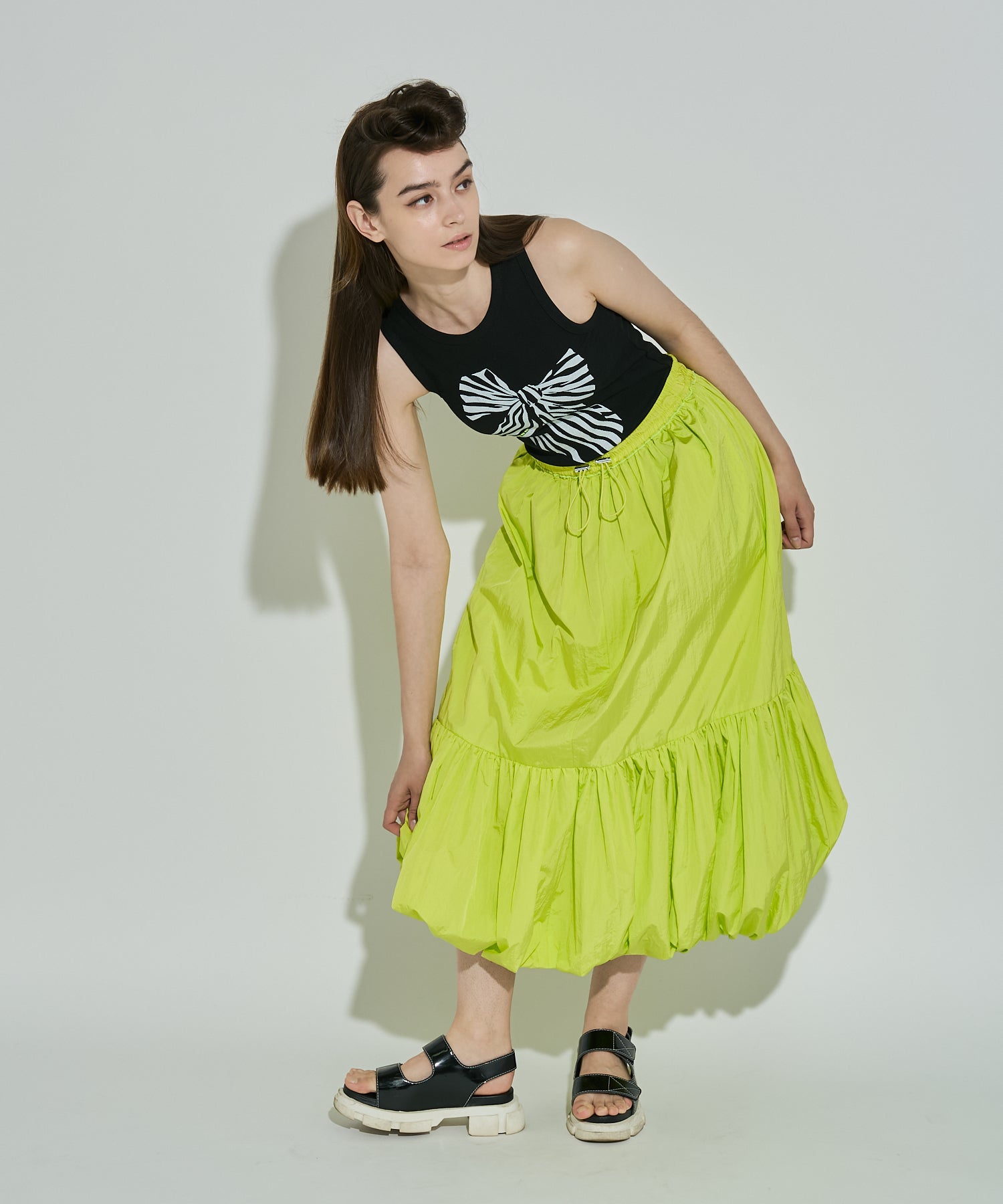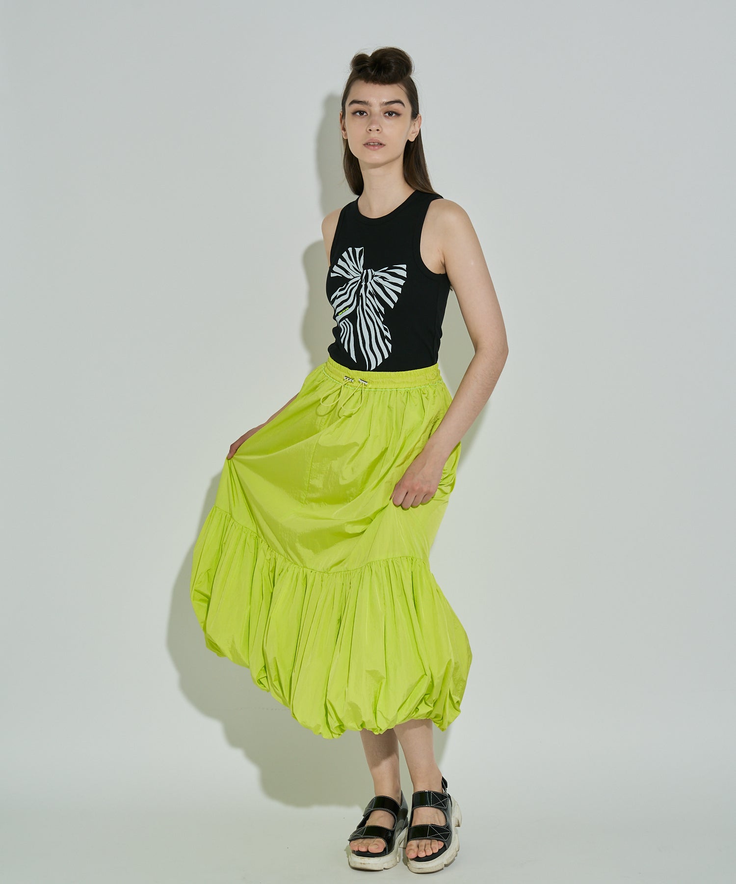 たっぷりのギャザーとバルーン切り替えがトレンドライクなスカート。ウエストはゴム+ドローコード仕様で、フィット感を調整しやすく、スポーティーなエッセンスをプラス。カジュアルなトップスとも好相性で、Tシャツやタンクトップと合わせたスタイリングもおすすめです。ボリュームたっぷりのデザインながらも軽やかな素材で動きやすく、コーディネートに立体感と華やかさをプラスしてくれる一着。カラーは夏らしいビタミンカラーのLIMEと着まわしやすいBLACKの2色展開。