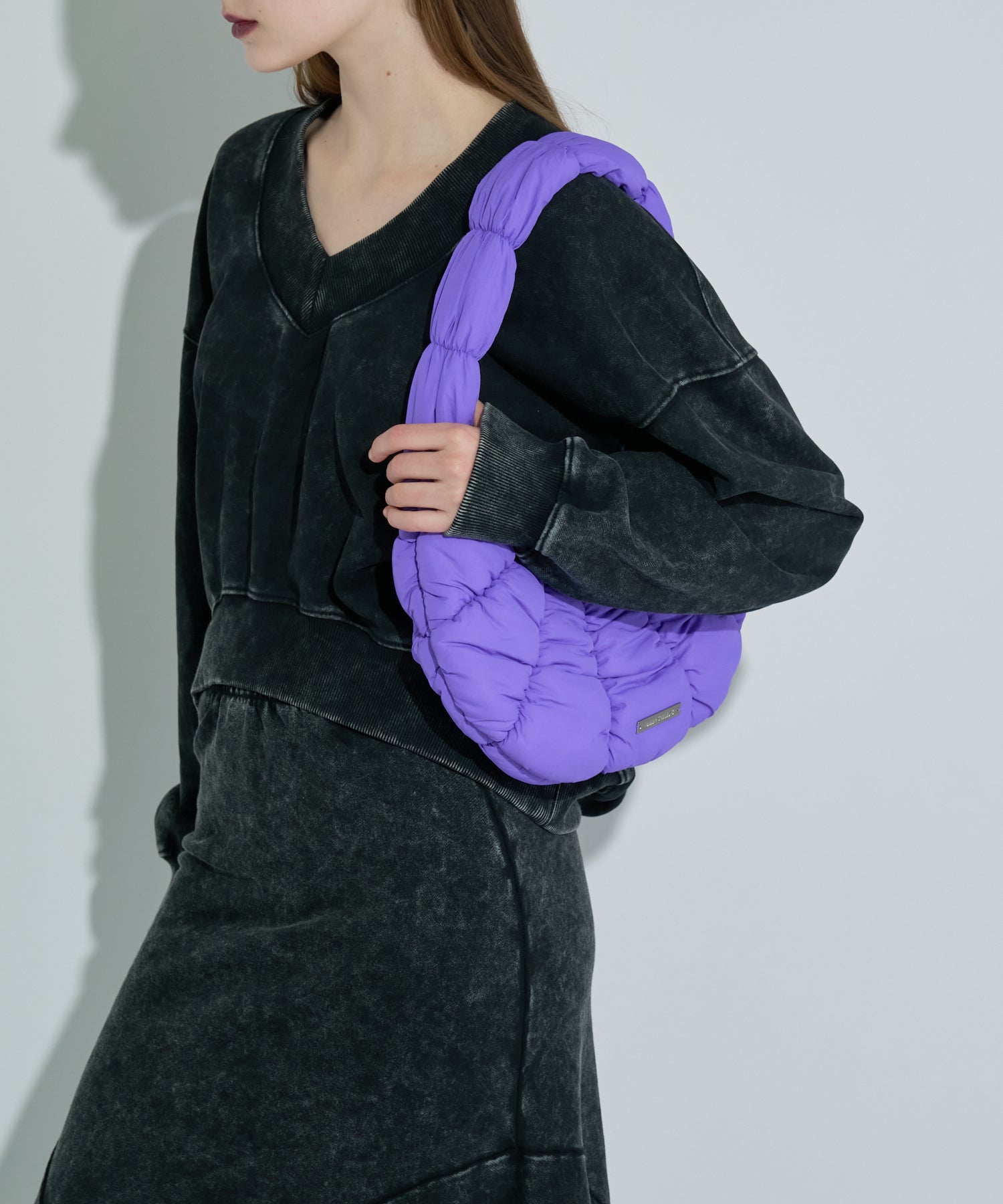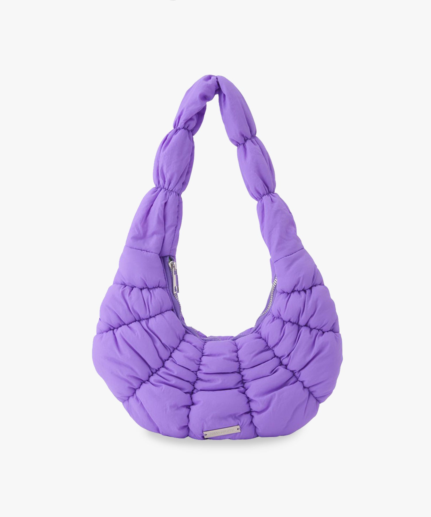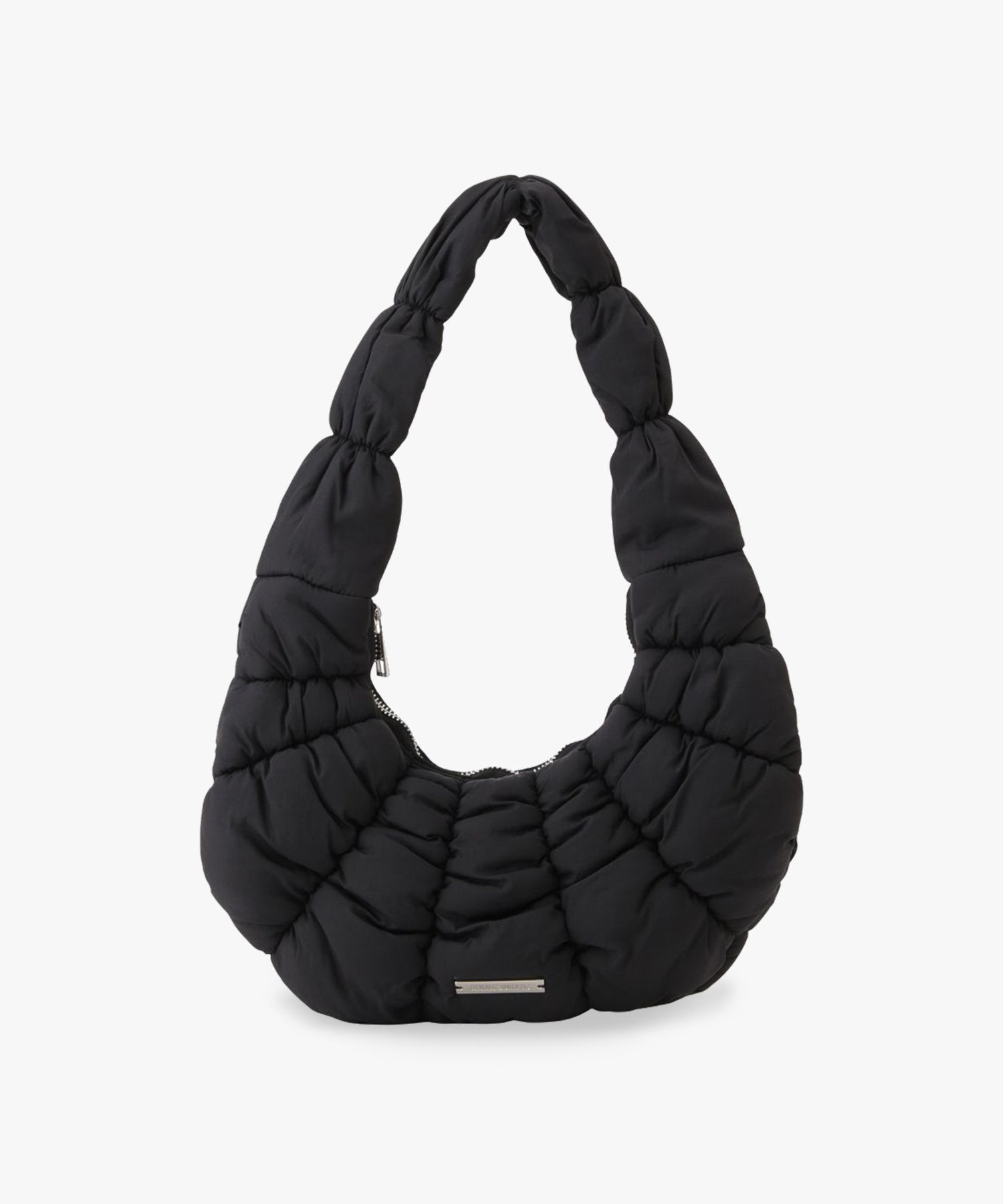 ぷっくりとしたキルティングデザインが目を惹き、まるでクロワッサンのようなユニークなフォルムのショルダーバッグ。程よいボリューム感と軽さを両立したポリエステル素材で、持ちやすさも◎。存在感がありながらもカジュアルスタイルに見やすく、コーディネートのアクセントになるアイテムです。ファスナー付きで、内側には異なる裏地を採用しており、チラリと見えるカラーが遊び心たっぷりでポイント。