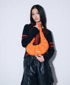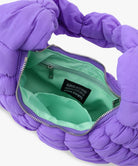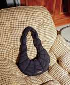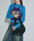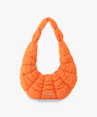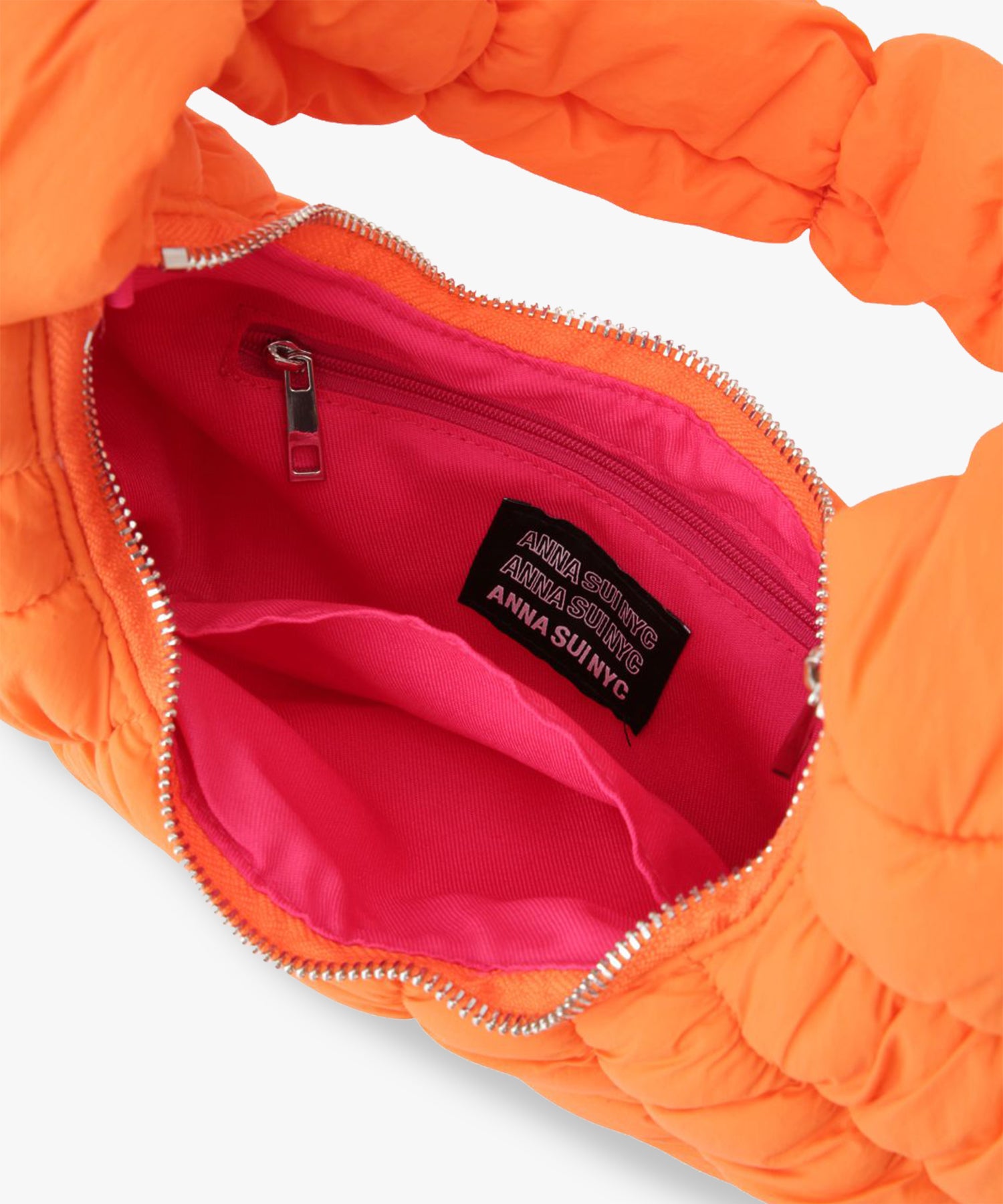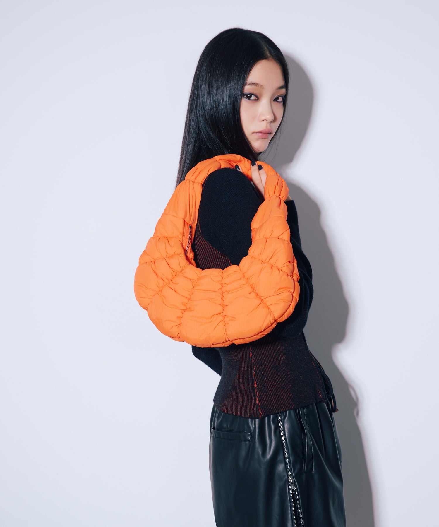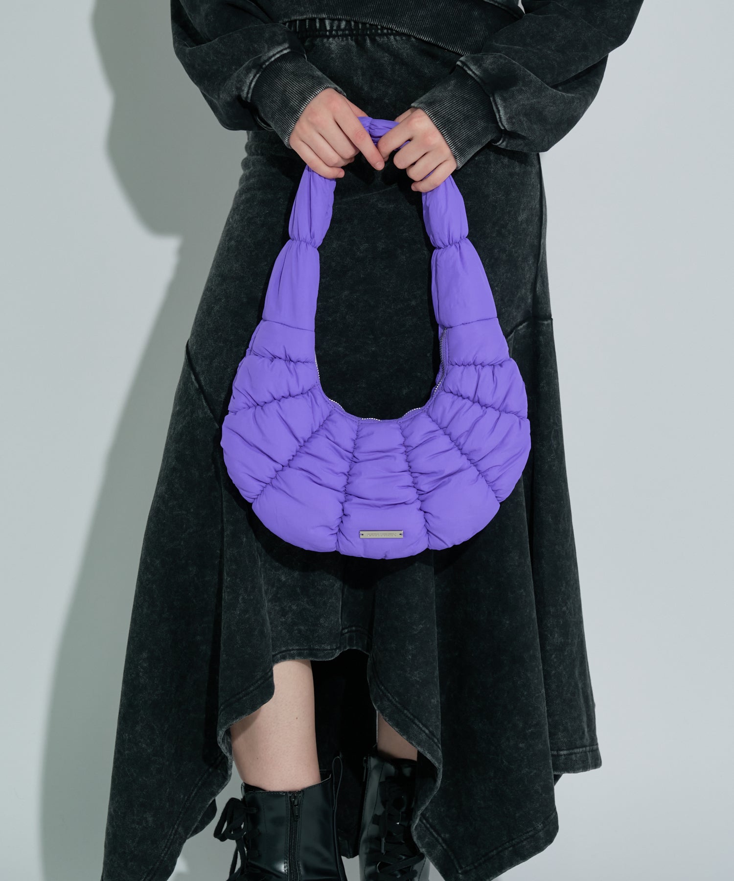 ぷっくりとしたキルティングデザインが目を惹き、まるでクロワッサンのようなユニークなフォルムのショルダーバッグ。程よいボリューム感と軽さを両立したポリエステル素材で、持ちやすさも◎。存在感がありながらもカジュアルスタイルに見やすく、コーディネートのアクセントになるアイテムです。ファスナー付きで、内側には異なる裏地を採用しており、チラリと見えるカラーが遊び心たっぷりでポイント。