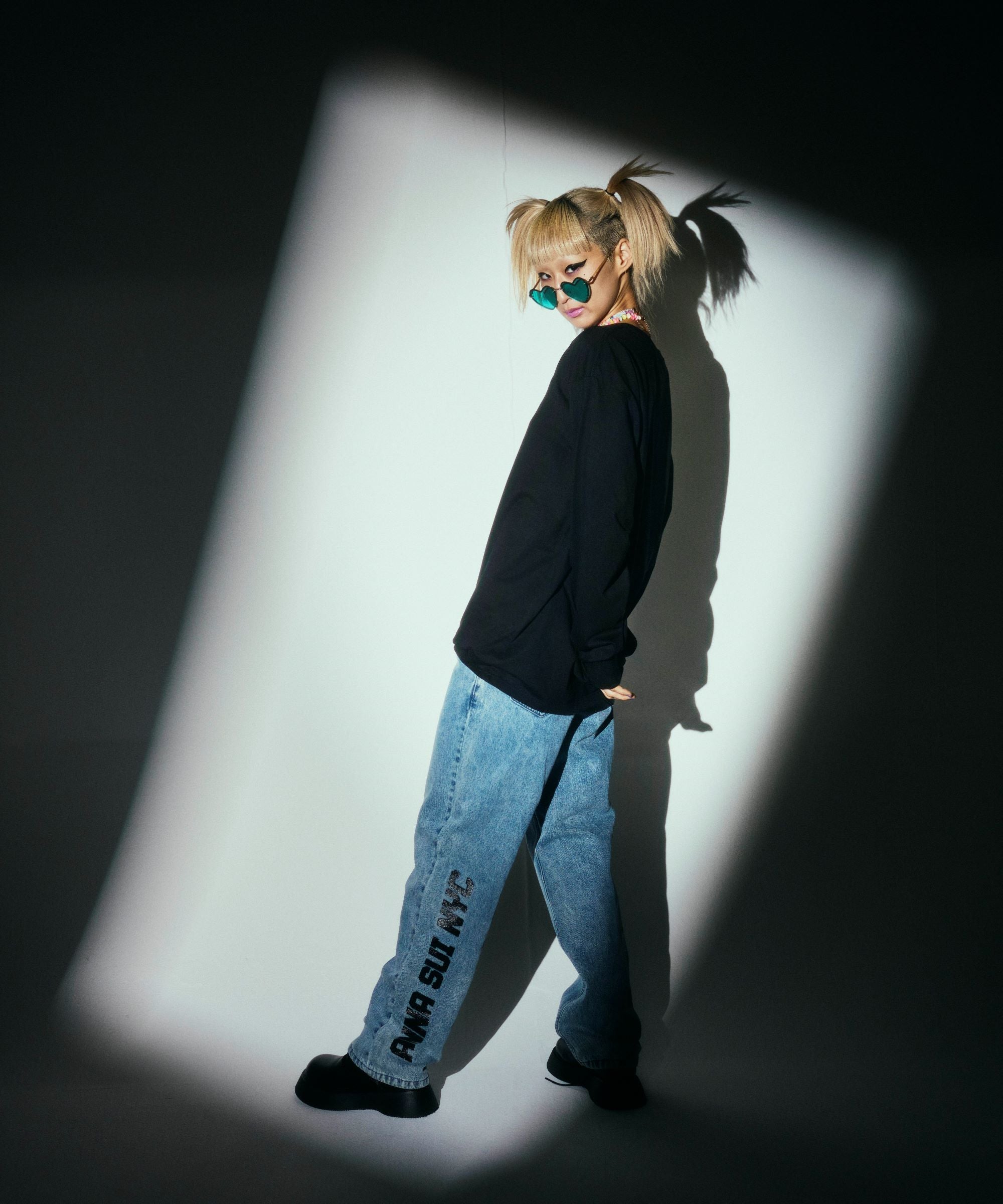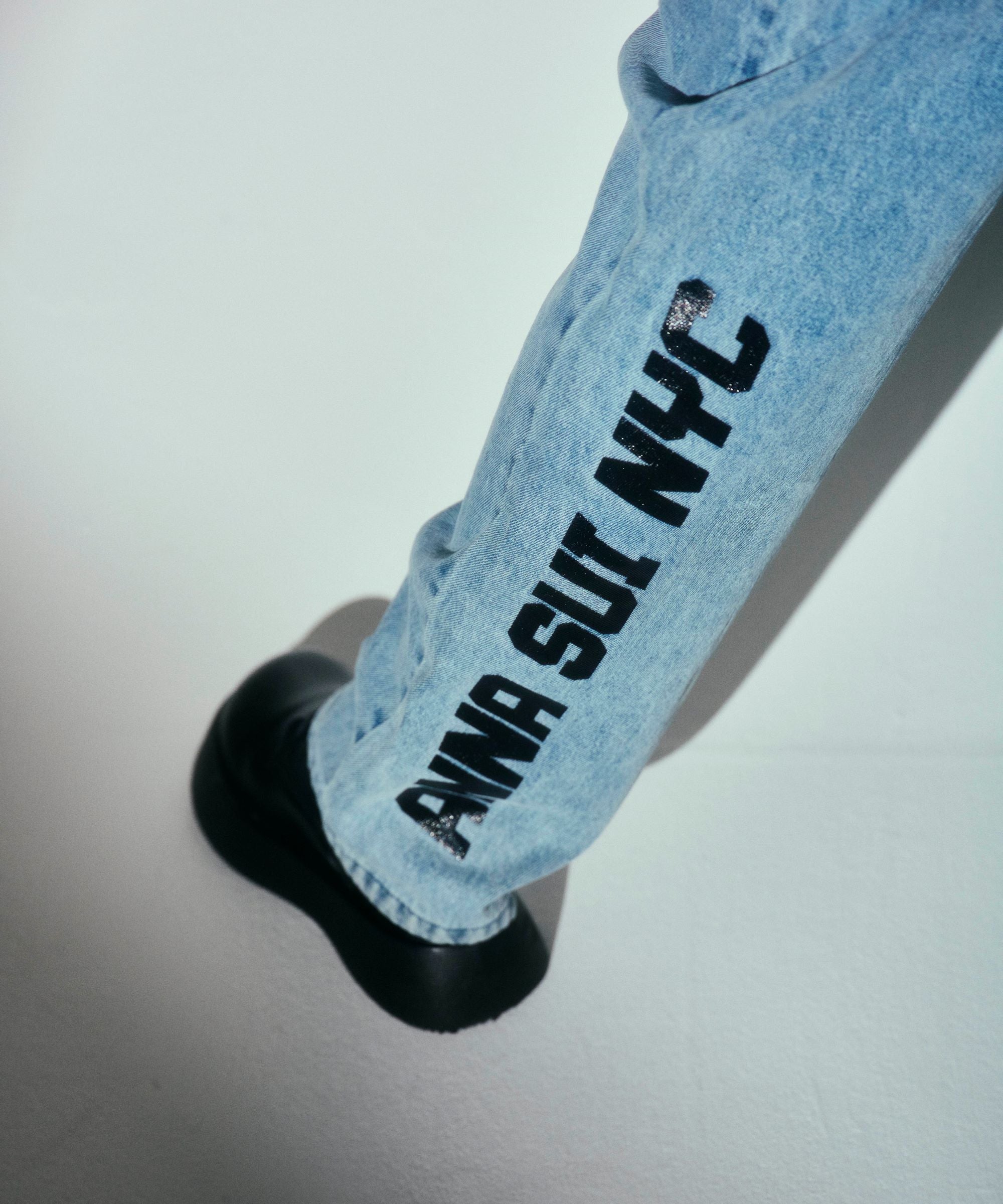 裾部分にあるANNA SUI NYCのビッグロゴが目を引くデニムパンツです。